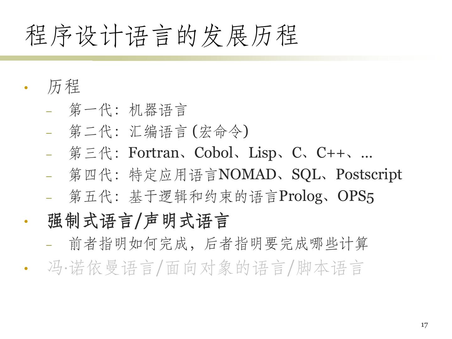 17 .程序设计语言的发展历程 • 历程 – 第一代:机器语言 – 第二代:汇编语言 (宏命令) – 第三代:Fortran、Cobol、Lisp、C、C++、… – 第四代:特定应用语言NOMAD、SQL、Postscript – 第五代:基于逻辑和约束的语言Prolog、OPS5 • 强制式语言/声明式语言 – 前者指明如何完成,后者指明要完成哪些计算 • 冯诺依曼语言/面向对象的语言/脚本语言 17
