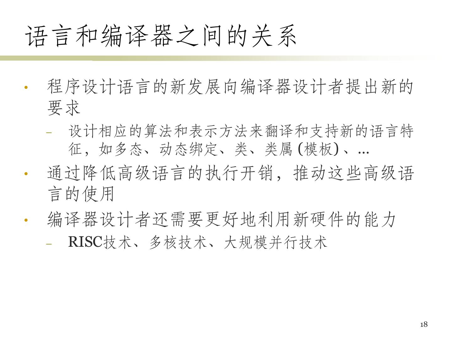 18 .语言和编译器之间的关系 • 程序设计语言的新发展向编译器设计者提出新的 要求 – 设计相应的算法和表示方法来翻译和支持新的语言特 征,如多态、动态绑定、类、类属 (模板) 、… • 通过降低高级语言的执行开销,推动这些高级语 言的使用 • 编译器设计者还需要更好地利用新硬件的能力 – RISC技术、多核技术、大规模并行技术 18