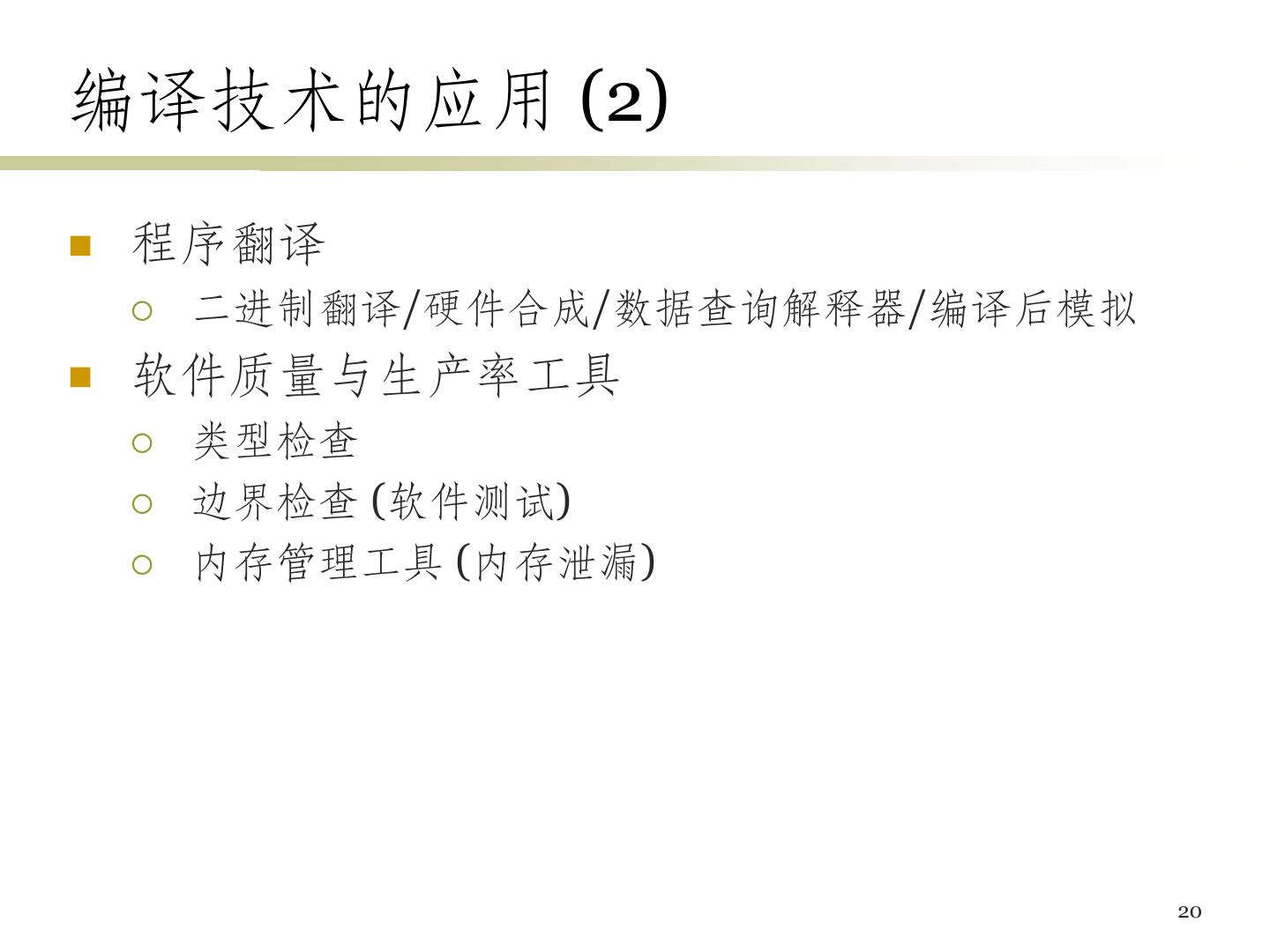 19 .编译技术的应用 (2) 程序翻译 二进制翻译/硬件合成/数据查询解释器/编译后模拟 软件质量与生产率工具 类型检查 边界检查 (软件测试) 内存管理工具 (内存泄漏) 20