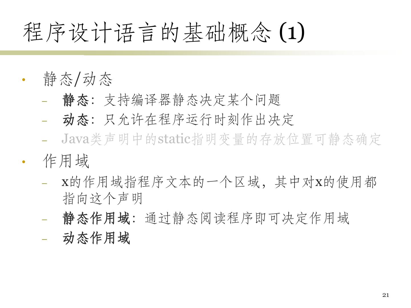 20 .程序设计语言的基础概念 (1) • 静态/动态 – 静态:支持编译器静态决定某个问题 – 动态:只允许在程序运行时刻作出决定 – Java类声明中的static指明变量的存放位置可静态确定 • 作用域 – x的作用域指程序文本的一个区域,其中对x的使用都 指向这个声明 – 静态作用域:通过静态阅读程序即可决定作用域 – 动态作用域 21