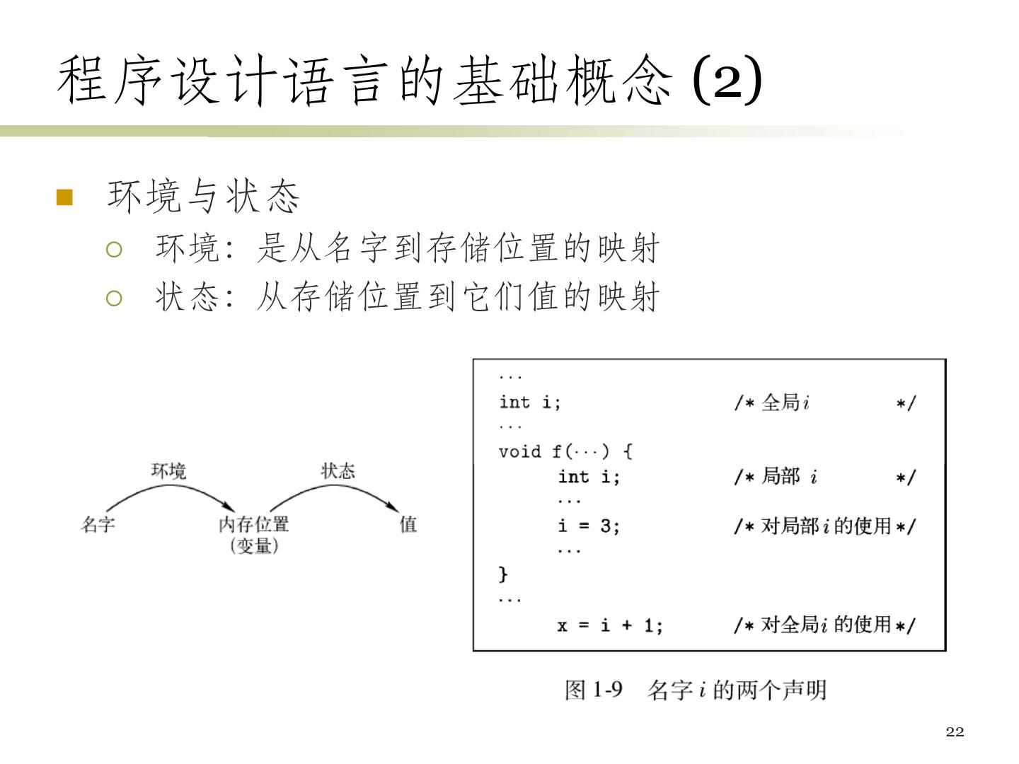 21 .程序设计语言的基础概念 (2) 环境与状态 环境:是从名字到存储位置的映射 状态:从存储位置到它们值的映射 22