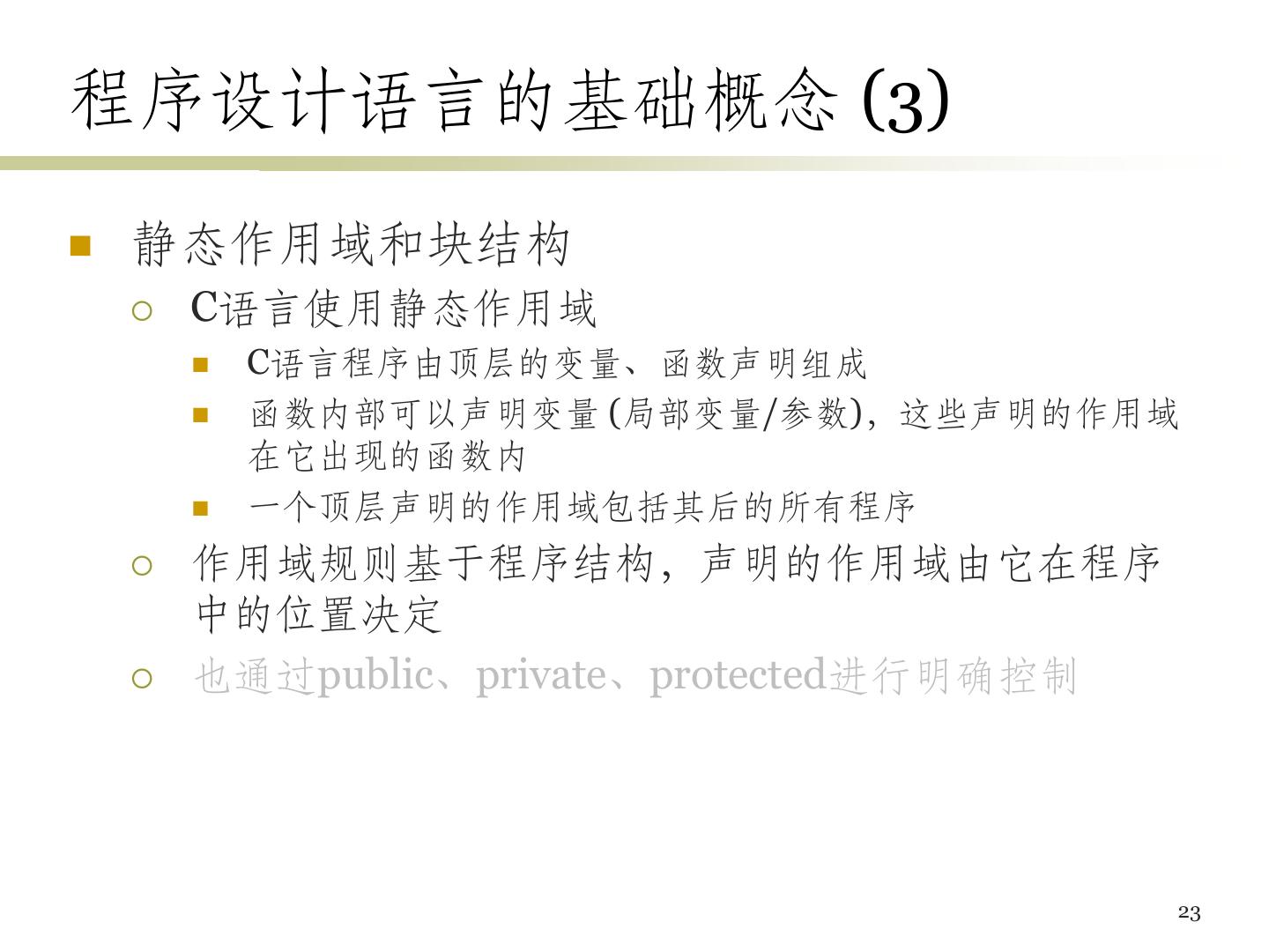 22 .程序设计语言的基础概念 (3) 静态作用域和块结构 C语言使用静态作用域 C语言程序由顶层的变量、函数声明组成 函数内部可以声明变量 (局部变量/参数),这些声明的作用域 在它出现的函数内 一个顶层声明的作用域包括其后的所有程序 作用域规则基于程序结构,声明的作用域由它在程序 中的位置决定 也通过public、private、protected进行明确控制 23