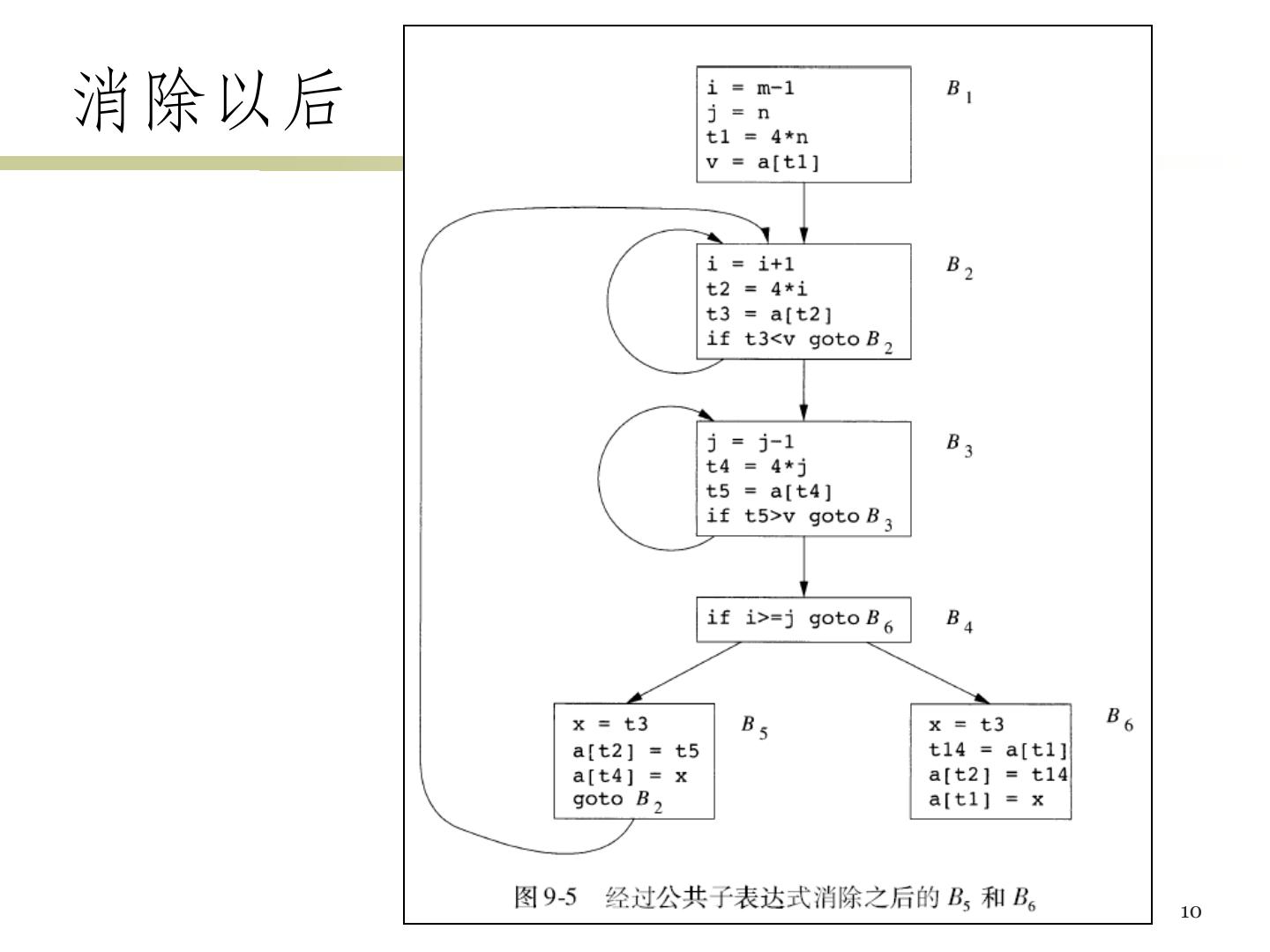 9 .例子 • B2、B3中计算了4 * i和 4 * j,且到达B5之前必 然经过B2、B3 • t2、t4在赋值后没有被 改变过,因此B5中可直 接使用它们 • B5中赋给x的值 (a[t6]) 和B2中赋给t3的值 (a[t2]) 相同 • t4替换t8后,B5中a[t8] 和B3中a[t4]又相同 t6, t7 => t2 • B6中的a[t13]和B1中的 a[t1]不同,因为B5可能 t8, t10 改变a的值 => t4 9