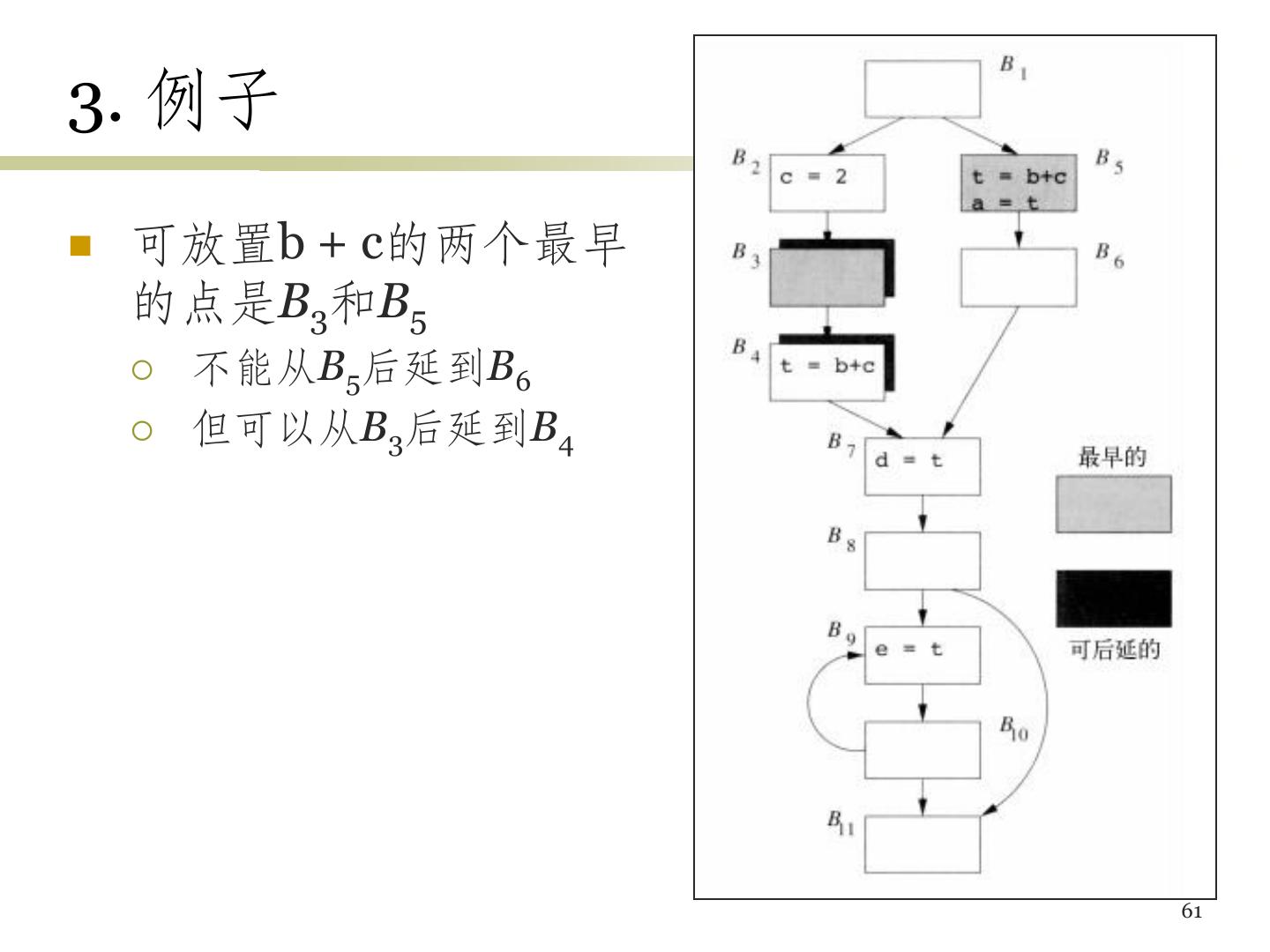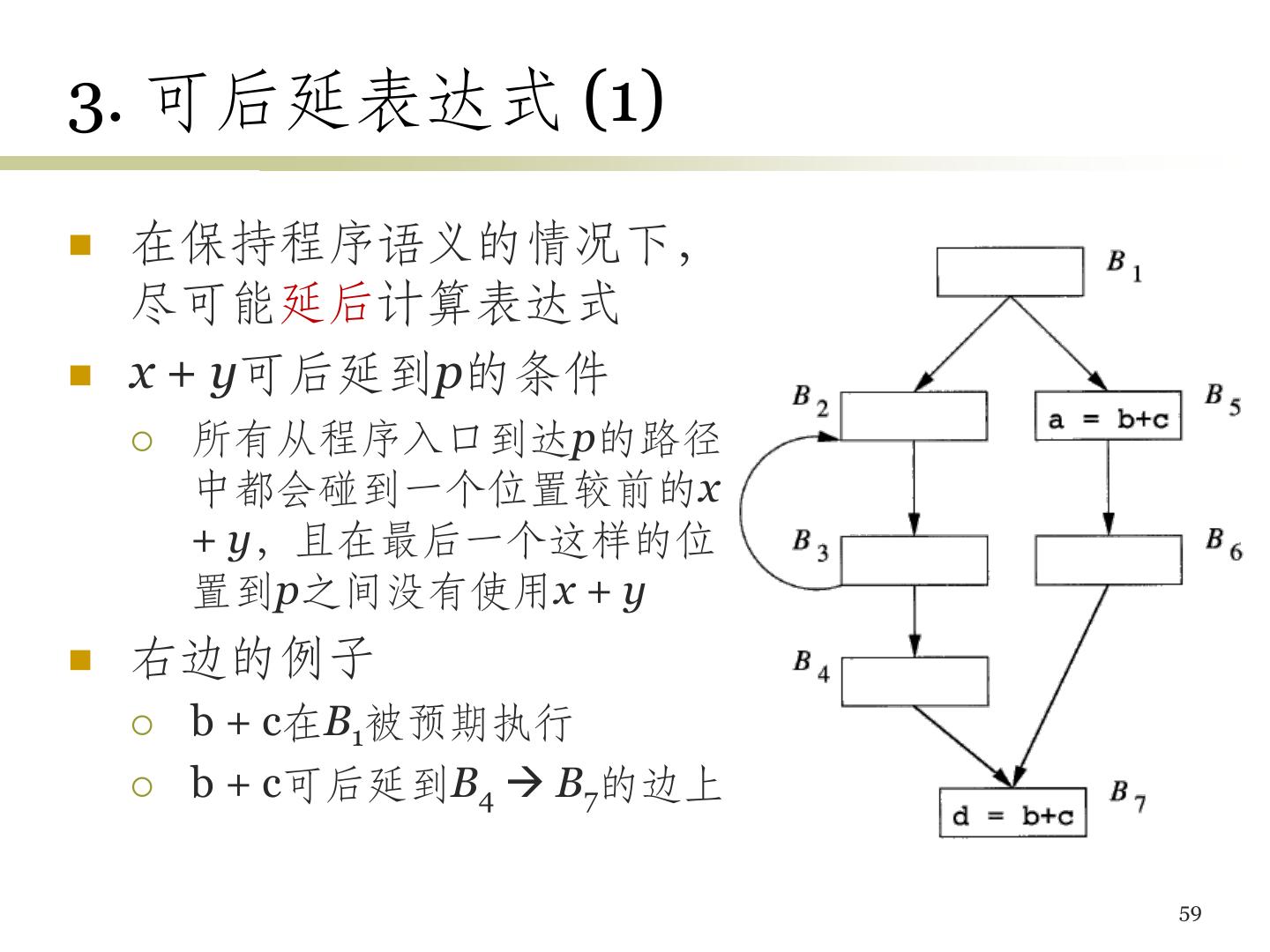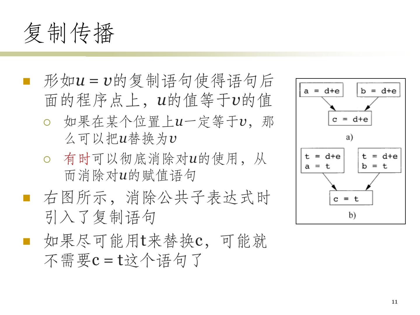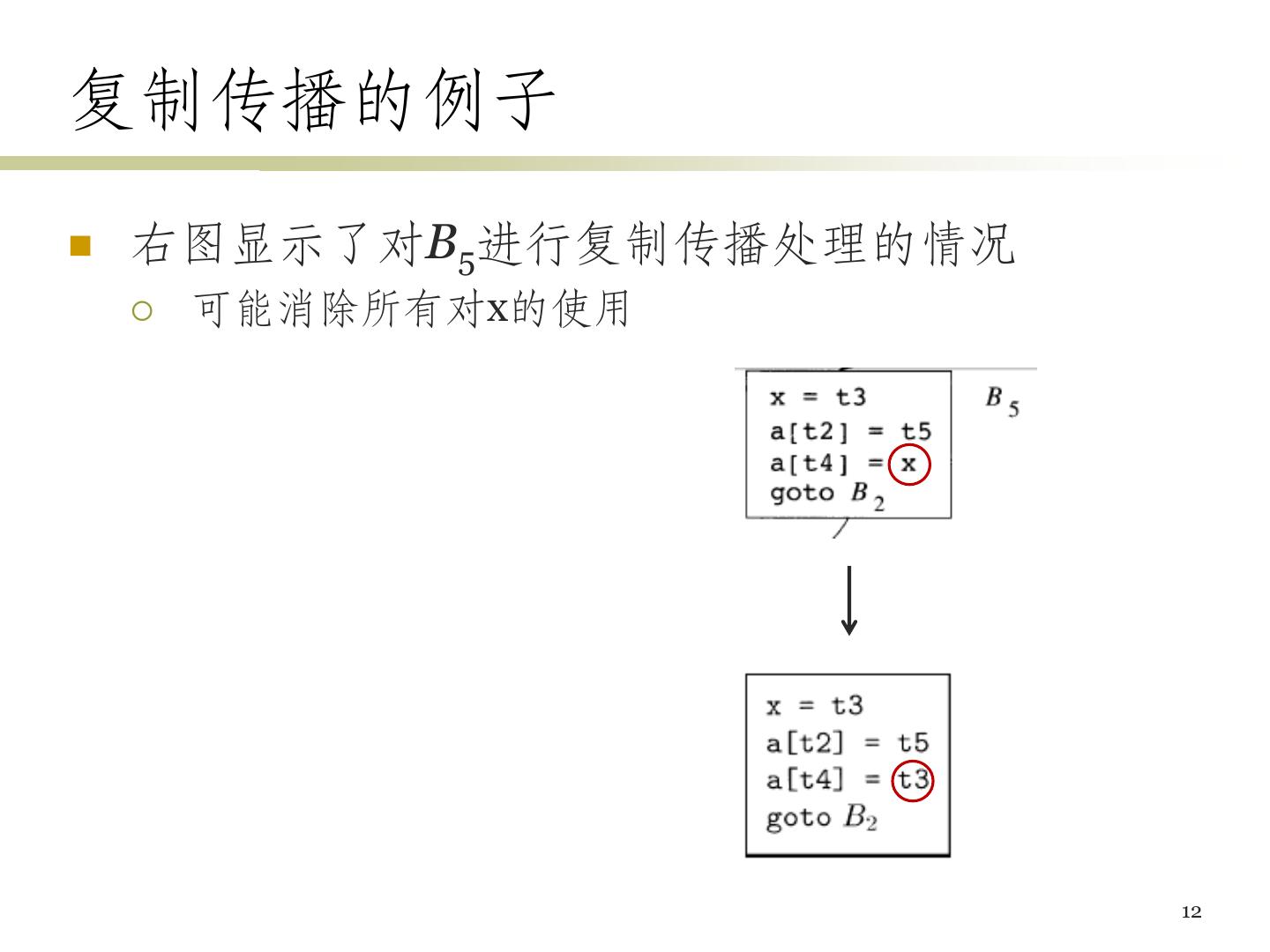 11 .复制传播 形如u = v的复制语句使得语句后 面的程序点上,u的值等于v的值 如果在某个位置上u一定等于v,那 么可以把u替换为v 有时可以彻底消除对u的使用,从 而消除对u的赋值语句 右图所示,消除公共子表达式时 引入了复制语句 如果尽可能用t来替换c,可能就 不需要c = t这个语句了 11
