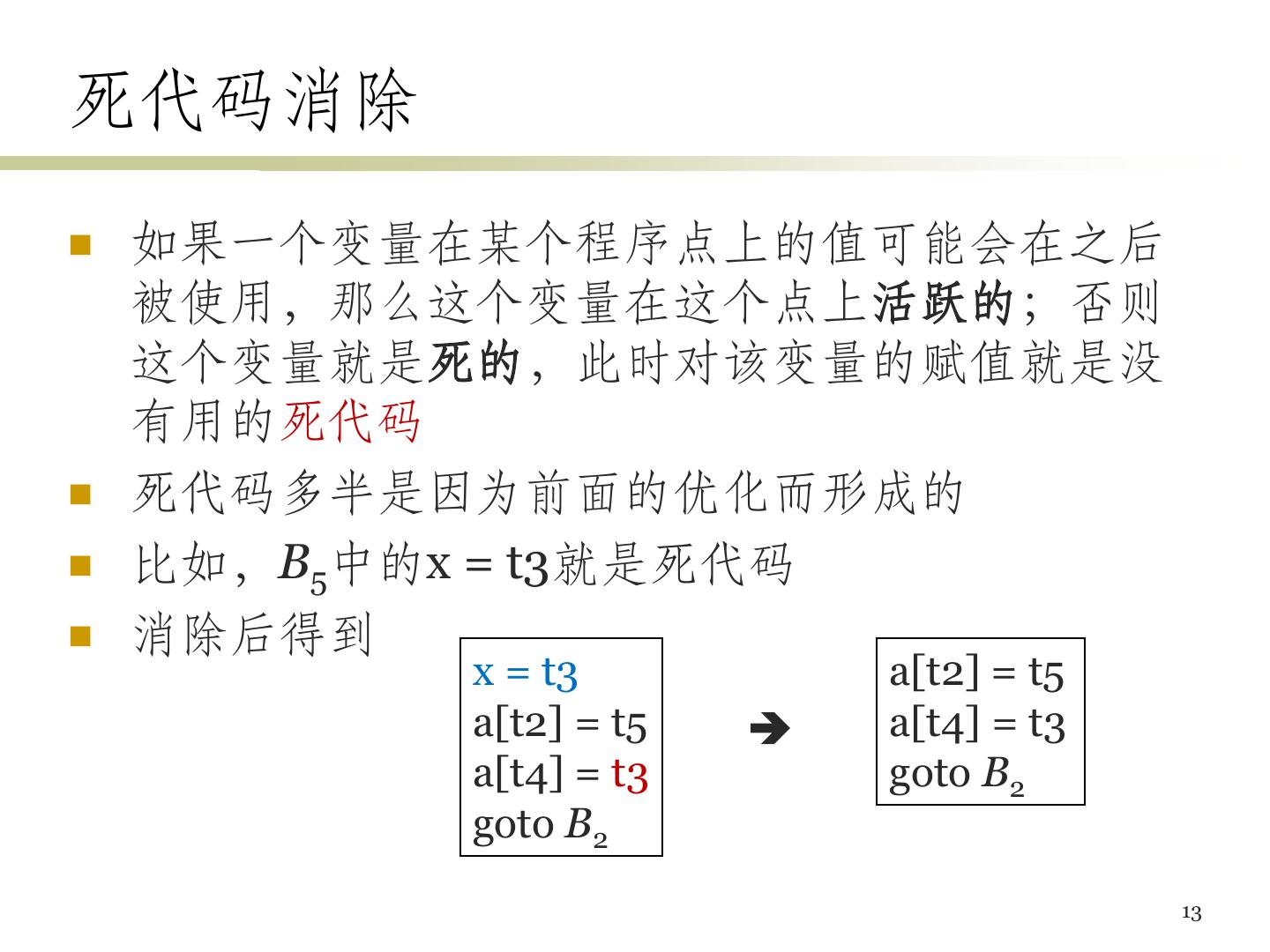 13 .死代码消除 如果一个变量在某个程序点上的值可能会在之后 被使用,那么这个变量在这个点上活跃的;否则 这个变量就是死的,此时对该变量的赋值就是没 有用的死代码 死代码多半是因为前面的优化而形成的 比如,B5中的x = t3就是死代码 消除后得到 x = t3 a[t2] = t5 a[t2] = t5 a[t4] = t3 a[t4] = t3 goto B2 goto B2 13
