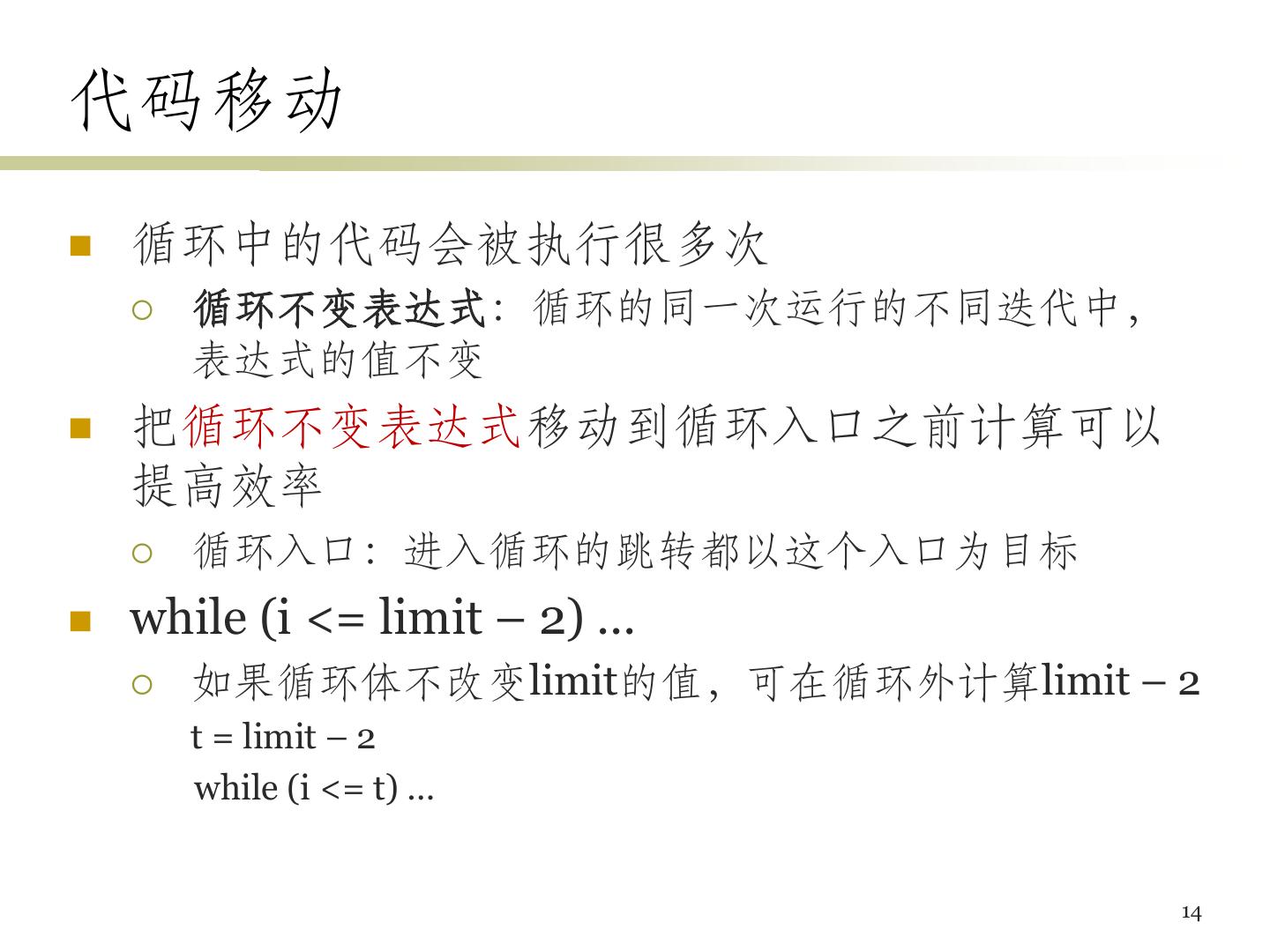 14 .代码移动 循环中的代码会被执行很多次 循环不变表达式:循环的同一次运行的不同迭代中, 表达式的值不变 把循环不变表达式移动到循环入口之前计算可以 提高效率 循环入口:进入循环的跳转都以这个入口为目标 while (i <= limit – 2) … 如果循环体不改变limit的值,可在循环外计算limit – 2 t = limit – 2 while (i <= t) … 14