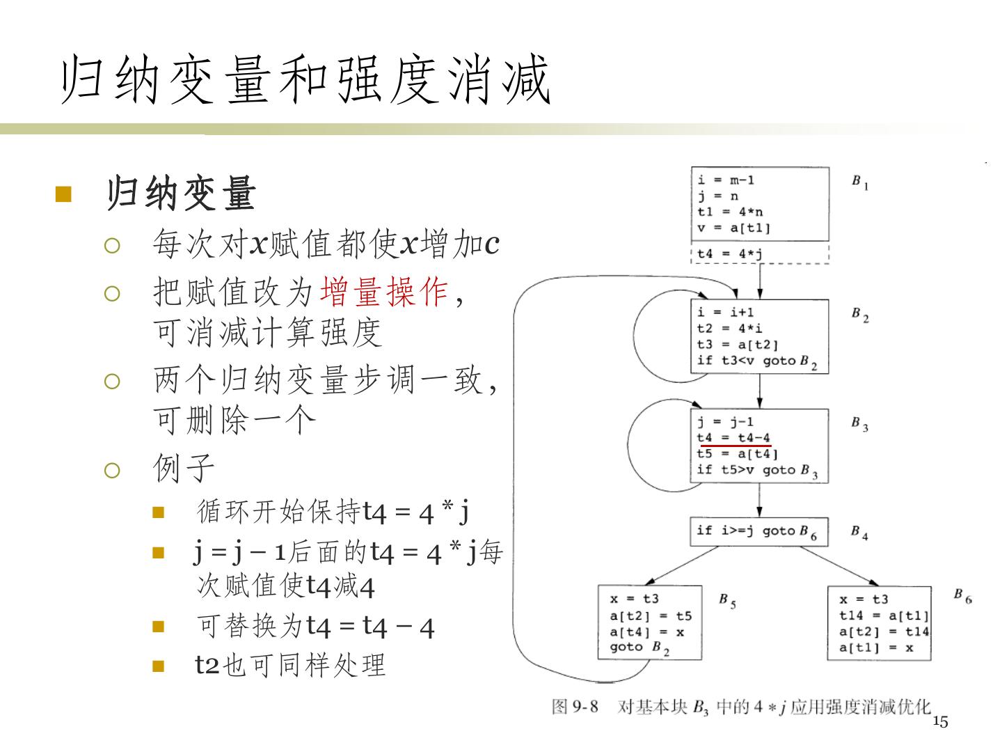 15 .归纳变量和强度消减 归纳变量 每次对x赋值都使x增加c 把赋值改为增量操作, 可消减计算强度 两个归纳变量步调一致, 可删除一个 例子 循环开始保持t4 = 4 * j j = j – 1后面的t4 = 4 * j每 次赋值使t4减4 可替换为t4 = t4 – 4 t2也可同样处理 15