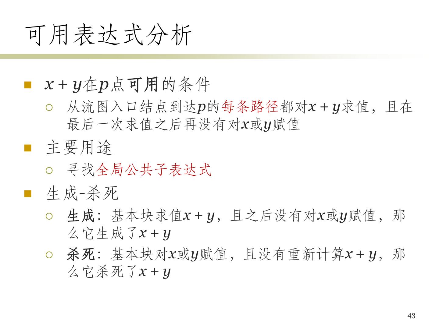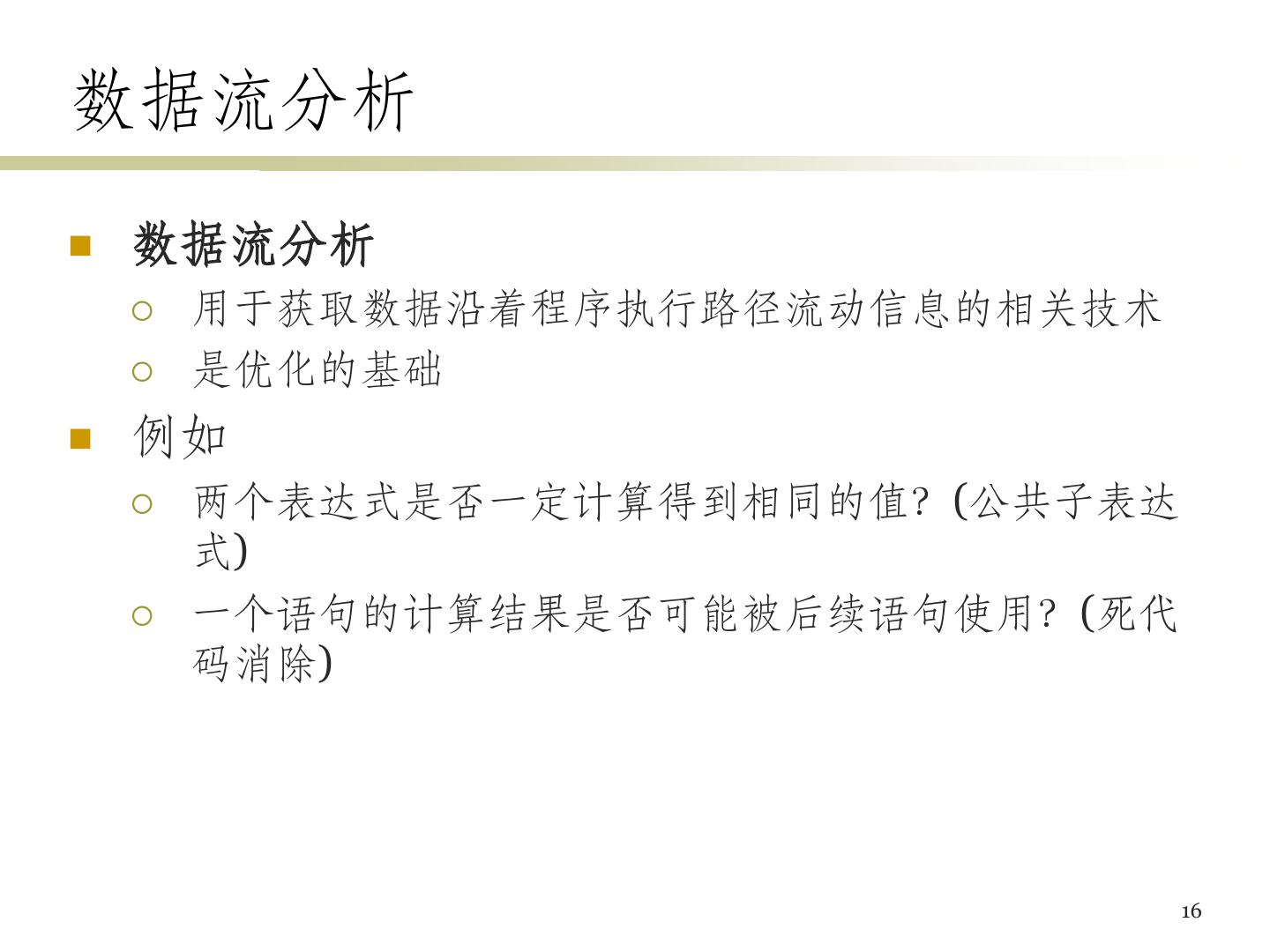 16 .数据流分析 数据流分析 用于获取数据沿着程序执行路径流动信息的相关技术 是优化的基础 例如 两个表达式是否一定计算得到相同的值?(公共子表达 式) 一个语句的计算结果是否可能被后续语句使用?(死代 码消除) 16
