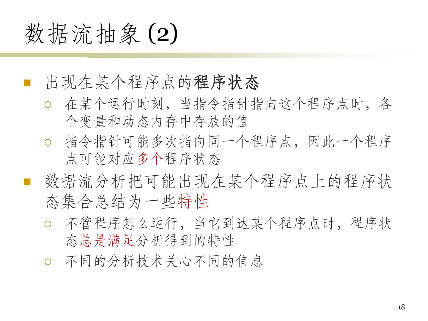 18 .数据流抽象 (2) 出现在某个程序点的程序状态 在某个运行时刻,当指令指针指向这个程序点时,各 个变量和动态内存中存放的值 指令指针可能多次指向同一个程序点,因此一个程序 点可能对应多个程序状态 数据流分析把可能出现在某个程序点上的程序状 态集合总结为一些特性 不管程序怎么运行,当它到达某个程序点时,程序状 态总是满足分析得到的特性 不同的分析技术关心不同的信息 18