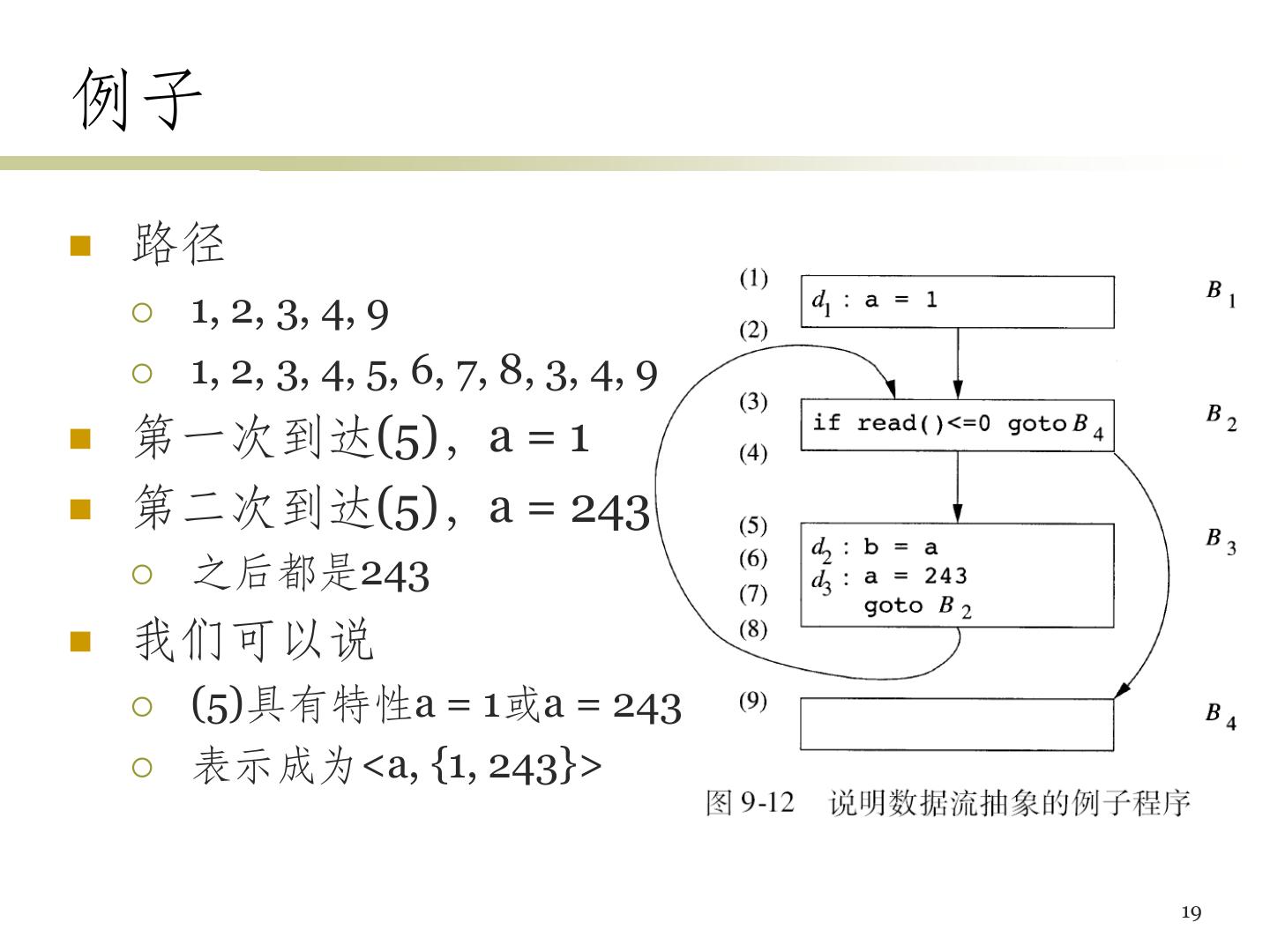19 .例子 路径 1, 2, 3, 4, 9 1, 2, 3, 4, 5, 6, 7, 8, 3, 4, 9 第一次到达(5),a = 1 第二次到达(5),a = 243 之后都是243 我们可以说 (5)具有特性a = 1或a = 243 表示成为<a, {1, 243}> 19