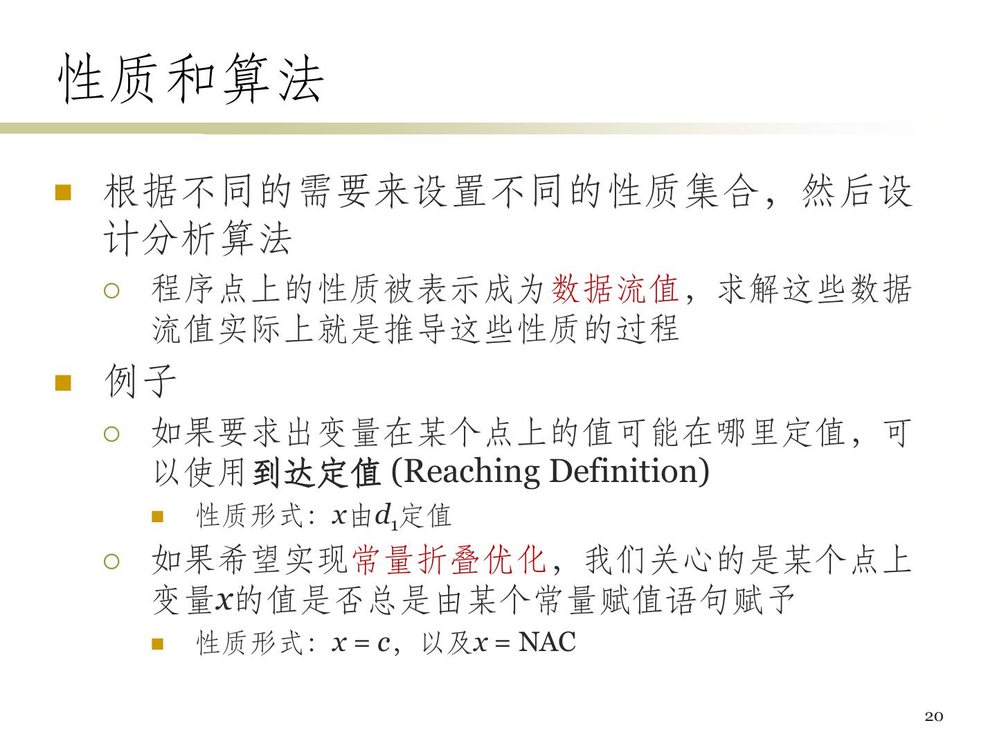 20 .性质和算法 根据不同的需要来设置不同的性质集合,然后设 计分析算法 程序点上的性质被表示成为数据流值,求解这些数据 流值实际上就是推导这些性质的过程 例子 如果要求出变量在某个点上的值可能在哪里定值,可 以使用到达定值 (Reaching Definition) 性质形式:x由d1定值 如果希望实现常量折叠优化,我们关心的是某个点上 变量x的值是否总是由某个常量赋值语句赋予 性质形式:x = c,以及x = NAC 20