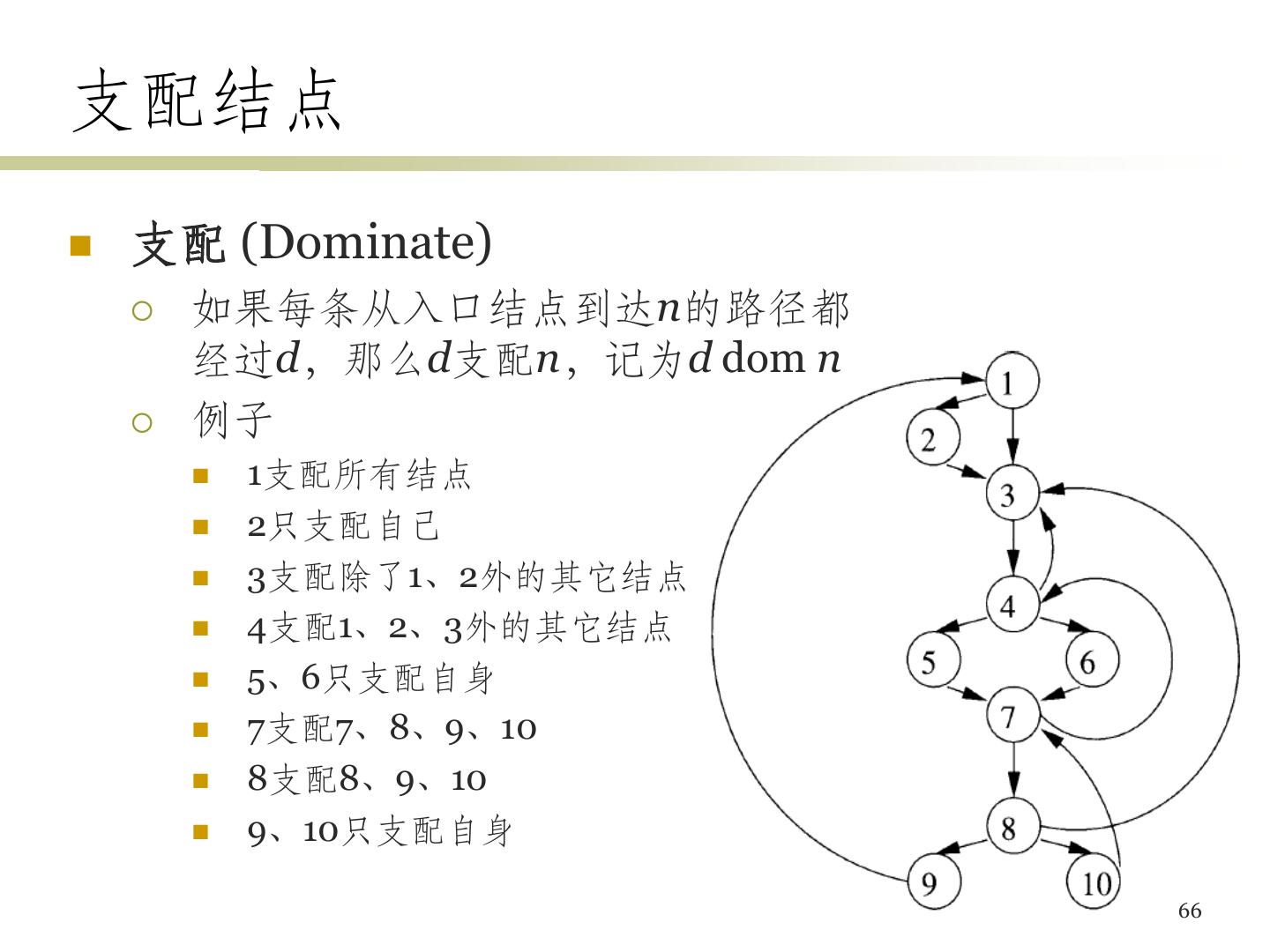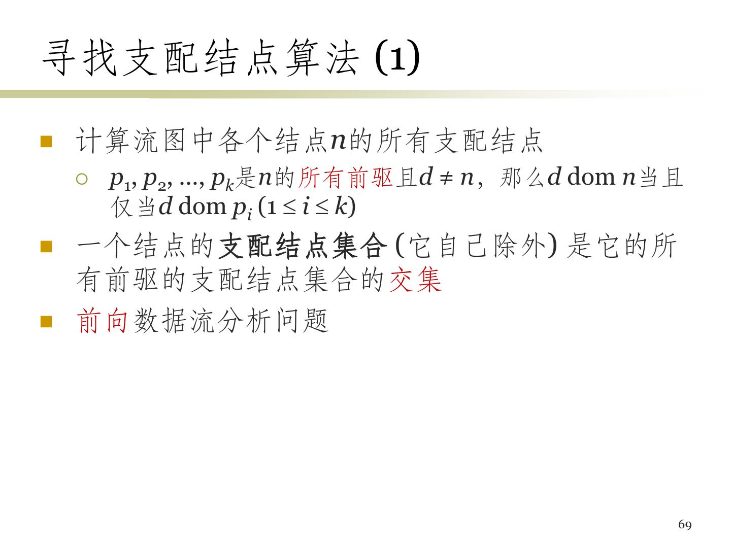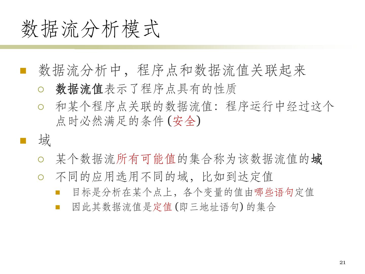 21 .数据流分析模式 数据流分析中,程序点和数据流值关联起来 数据流值表示了程序点具有的性质 和某个程序点关联的数据流值:程序运行中经过这个 点时必然满足的条件 (安全) 域 某个数据流所有可能值的集合称为该数据流值的域 不同的应用选用不同的域,比如到达定值 目标是分析在某个点上,各个变量的值由哪些语句定值 因此其数据流值是定值 (即三地址语句) 的集合 21