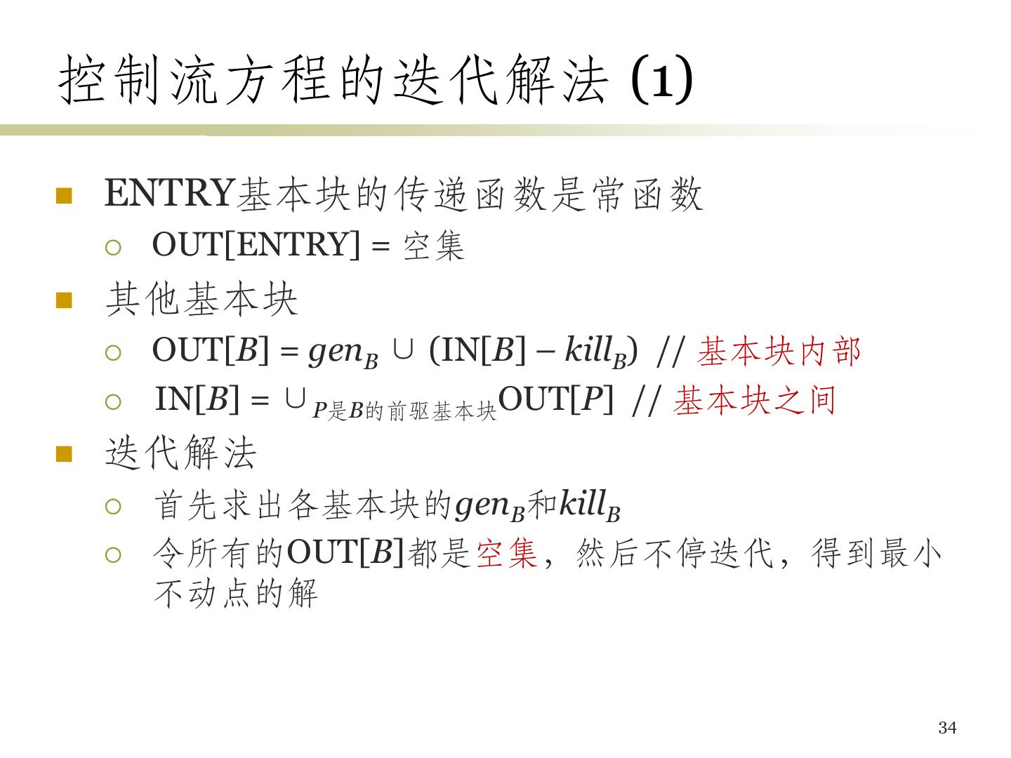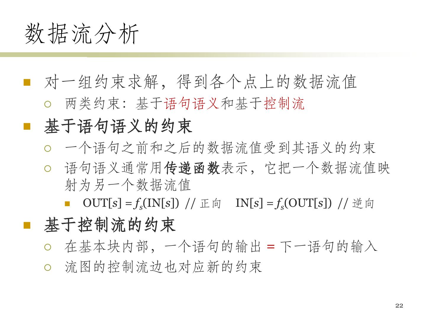 22 .数据流分析 对一组约束求解,得到各个点上的数据流值 两类约束:基于语句语义和基于控制流 基于语句语义的约束 一个语句之前和之后的数据流值受到其语义的约束 语句语义通常用传递函数表示,它把一个数据流值映 射为另一个数据流值 OUT[s] = fs(IN[s]) // 正向 IN[s] = fs(OUT[s]) // 逆向 基于控制流的约束 在基本块内部,一个语句的输出 = 下一语句的输入 流图的控制流边也对应新的约束 22