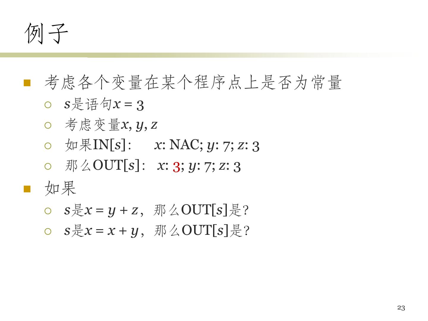 23 .例子 考虑各个变量在某个程序点上是否为常量 s是语句x = 3 考虑变量x, y, z 如果IN[s]: x: NAC; y: 7; z: 3 那么OUT[s]: x: 3; y: 7; z: 3 如果 s是x = y + z,那么OUT[s]是? s是x = x + y,那么OUT[s]是? 23