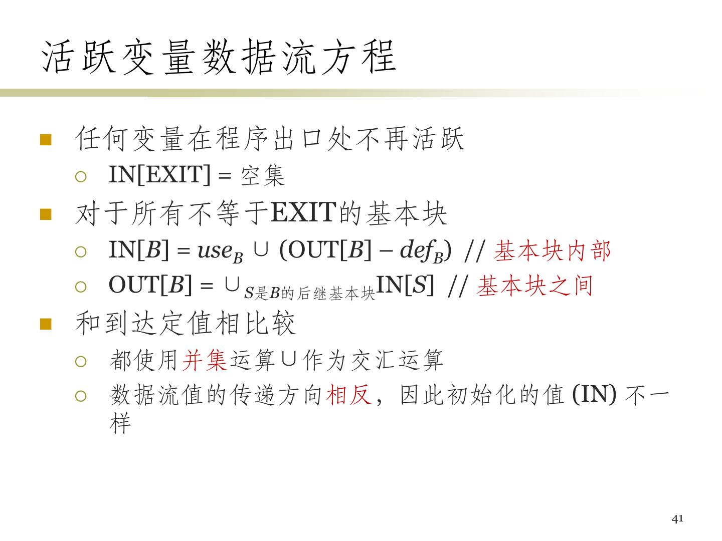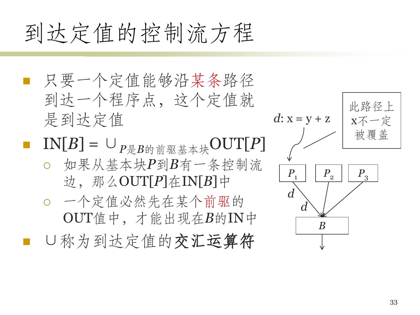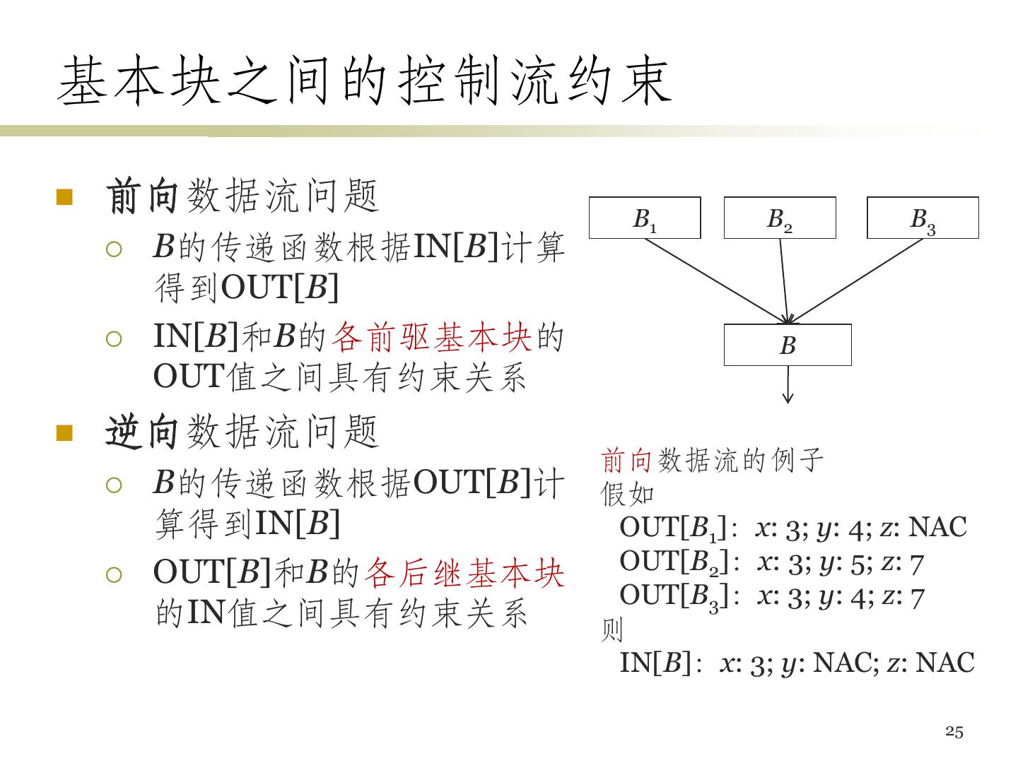 25 .基本块之间的控制流约束 前向数据流问题 B1 B2 B3 B的传递函数根据IN[B]计算 得到OUT[B] IN[B]和B的各前驱基本块的 B OUT值之间具有约束关系 逆向数据流问题 前向数据流的例子 B的传递函数根据OUT[B]计 假如 算得到IN[B] OUT[B1]:x: 3; y: 4; z: NAC OUT[B]和B的各后继基本块 OUT[B2]:x: 3; y: 5; z: 7 OUT[B3]:x: 3; y: 4; z: 7 的IN值之间具有约束关系 则 IN[B]:x: 3; y: NAC; z: NAC 25