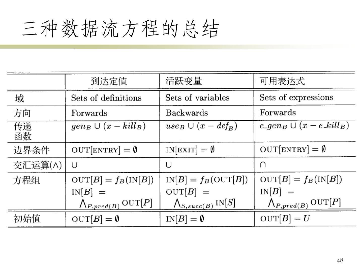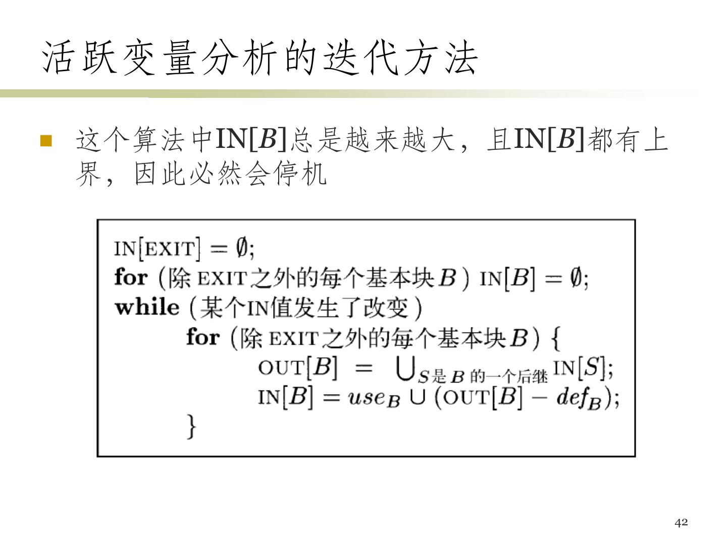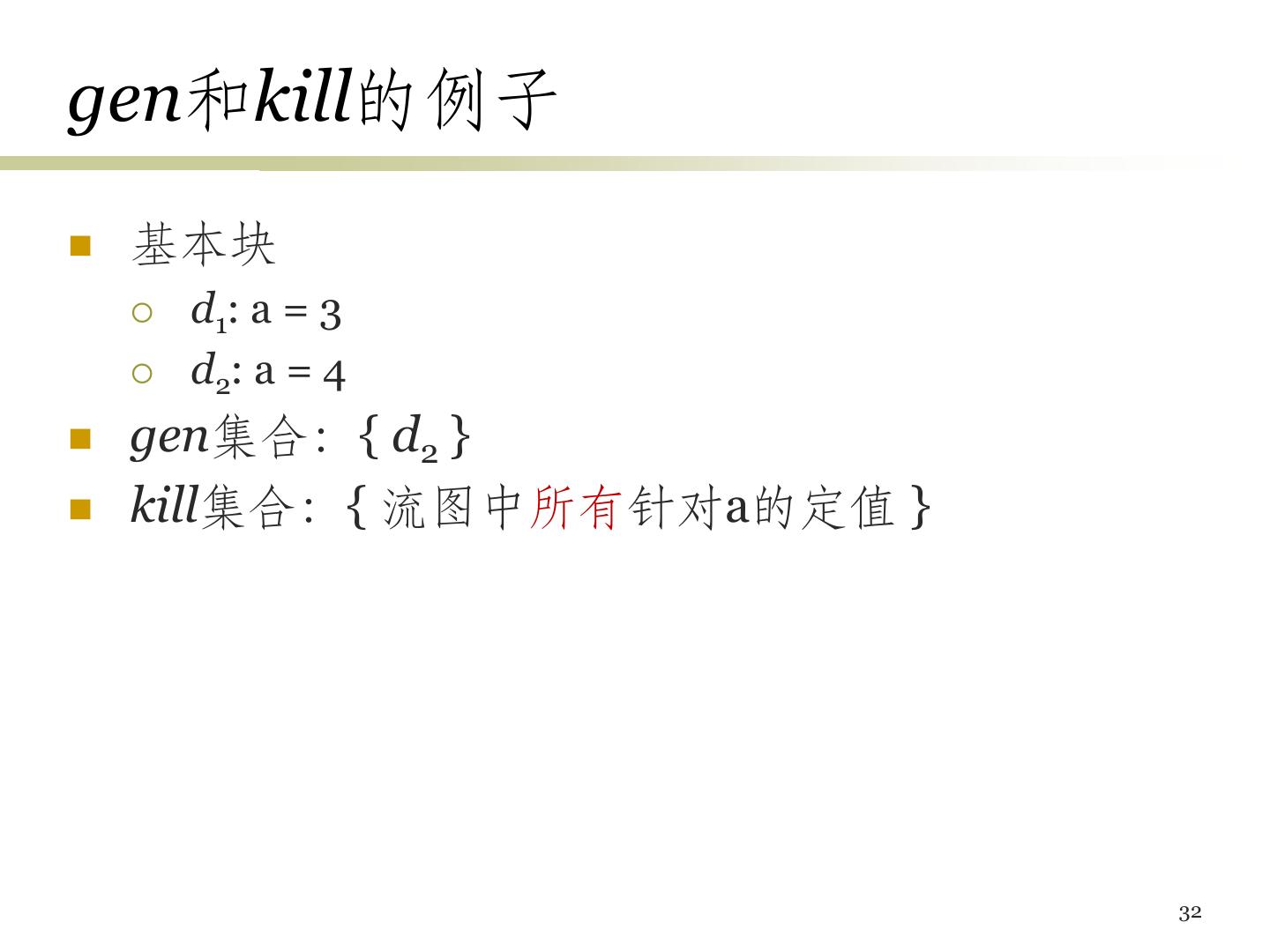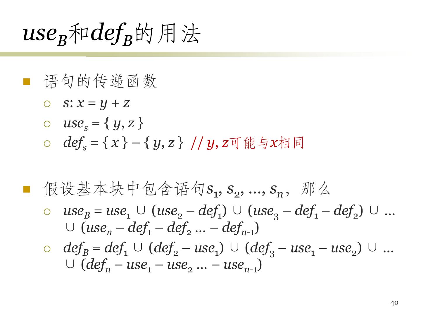 25 .基本块之间的控制流约束 前向数据流问题 B1 B2 B3 B的传递函数根据IN[B]计算 得到OUT[B] IN[B]和B的各前驱基本块的 B OUT值之间具有约束关系 逆向数据流问题 前向数据流的例子 B的传递函数根据OUT[B]计 假如 算得到IN[B] OUT[B1]:x: 3; y: 4; z: NAC OUT[B]和B的各后继基本块 OUT[B2]:x: 3; y: 5; z: 7 OUT[B3]:x: 3; y: 4; z: 7 的IN值之间具有约束关系 则 IN[B]:x: 3; y: NAC; z: NAC 25