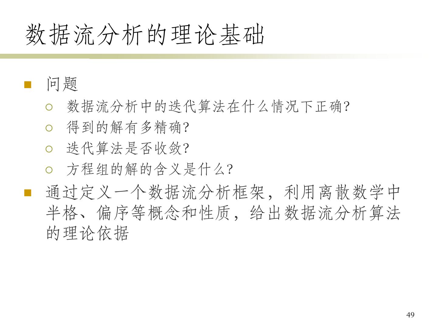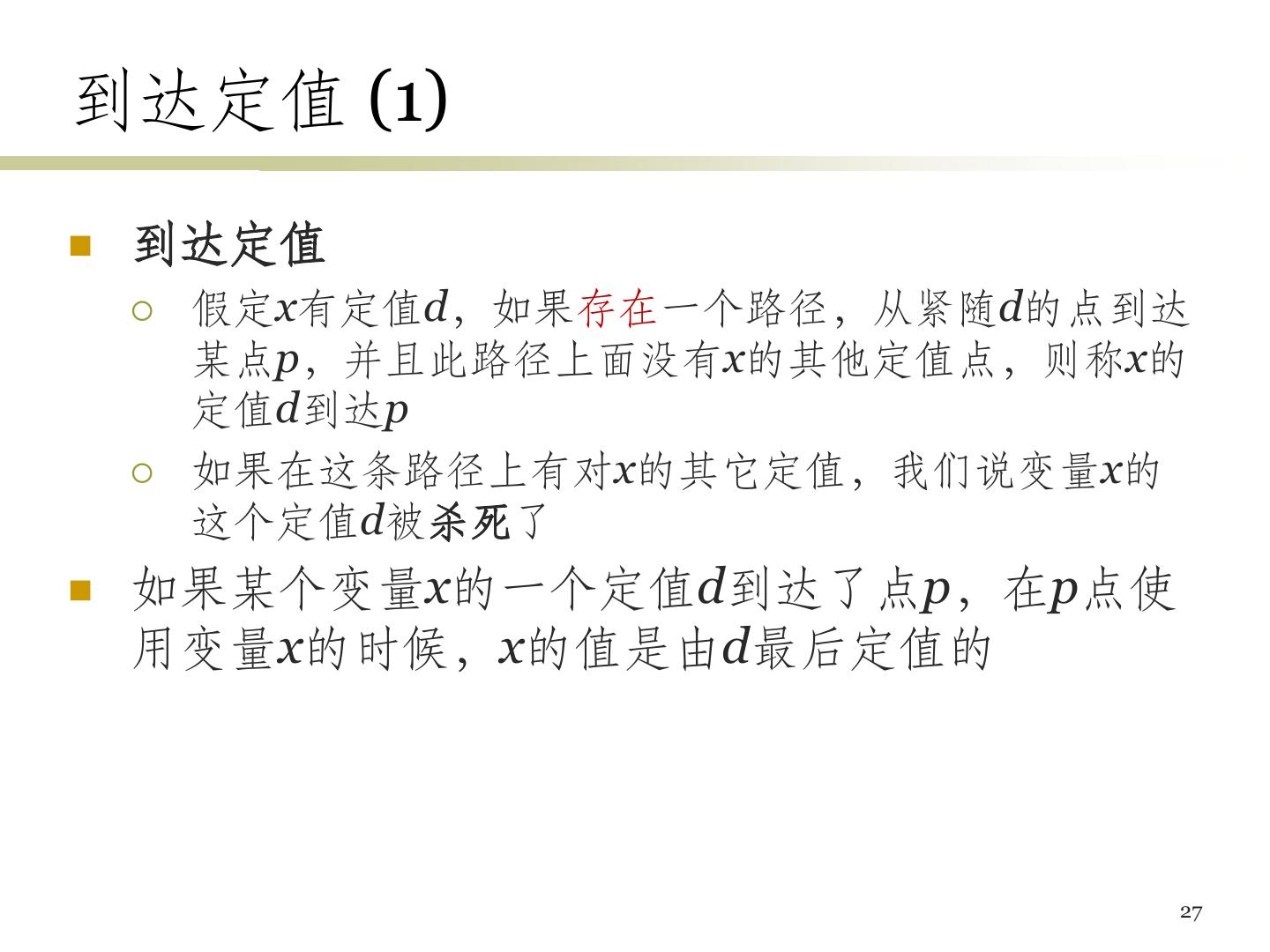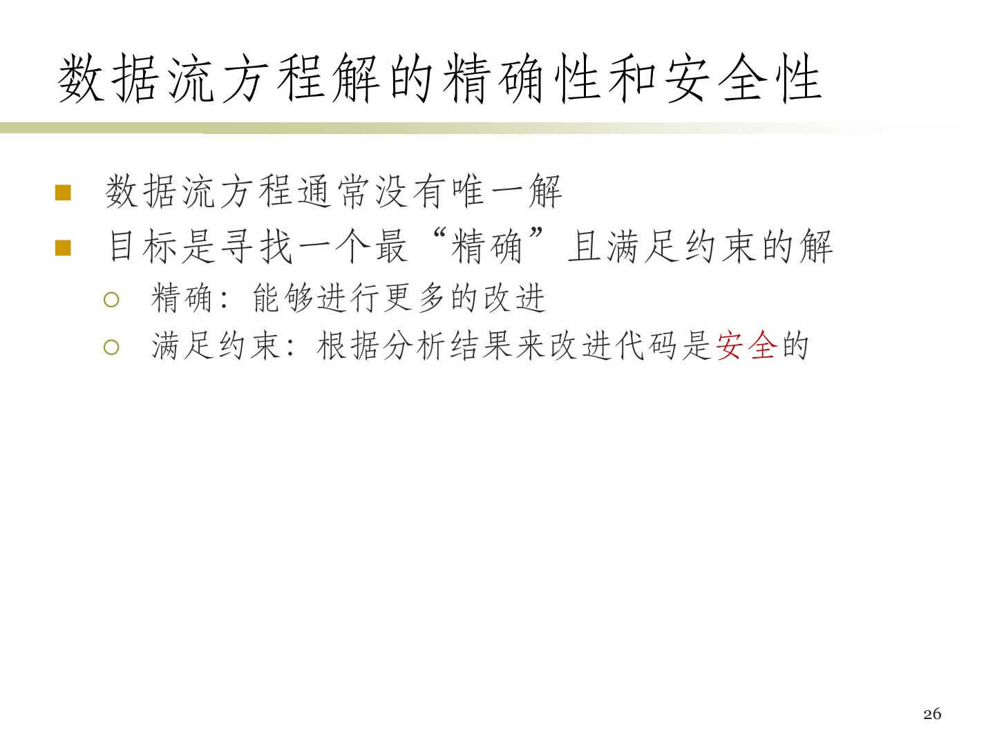 26 .数据流方程解的精确性和安全性 数据流方程通常没有唯一解 目标是寻找一个最“精确”且满足约束的解 精确:能够进行更多的改进 满足约束:根据分析结果来改进代码是安全的 26
