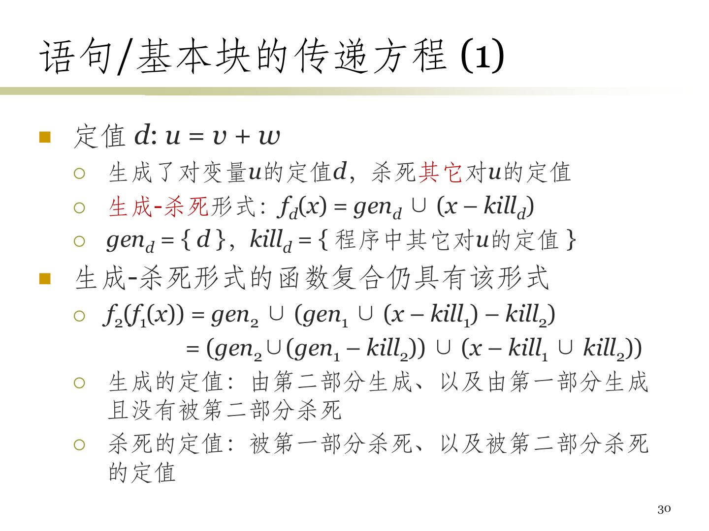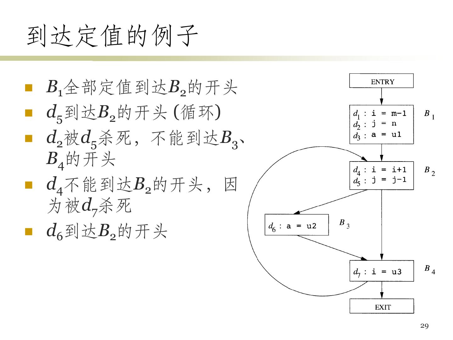 29 .到达定值的例子 B1全部定值到达B2的开头 d5到达B2的开头 (循环) d2被d5杀死,不能到达B3、 B4的开头 d4不能到达B2的开头,因 为被d7杀死 d6到达B2的开头 29