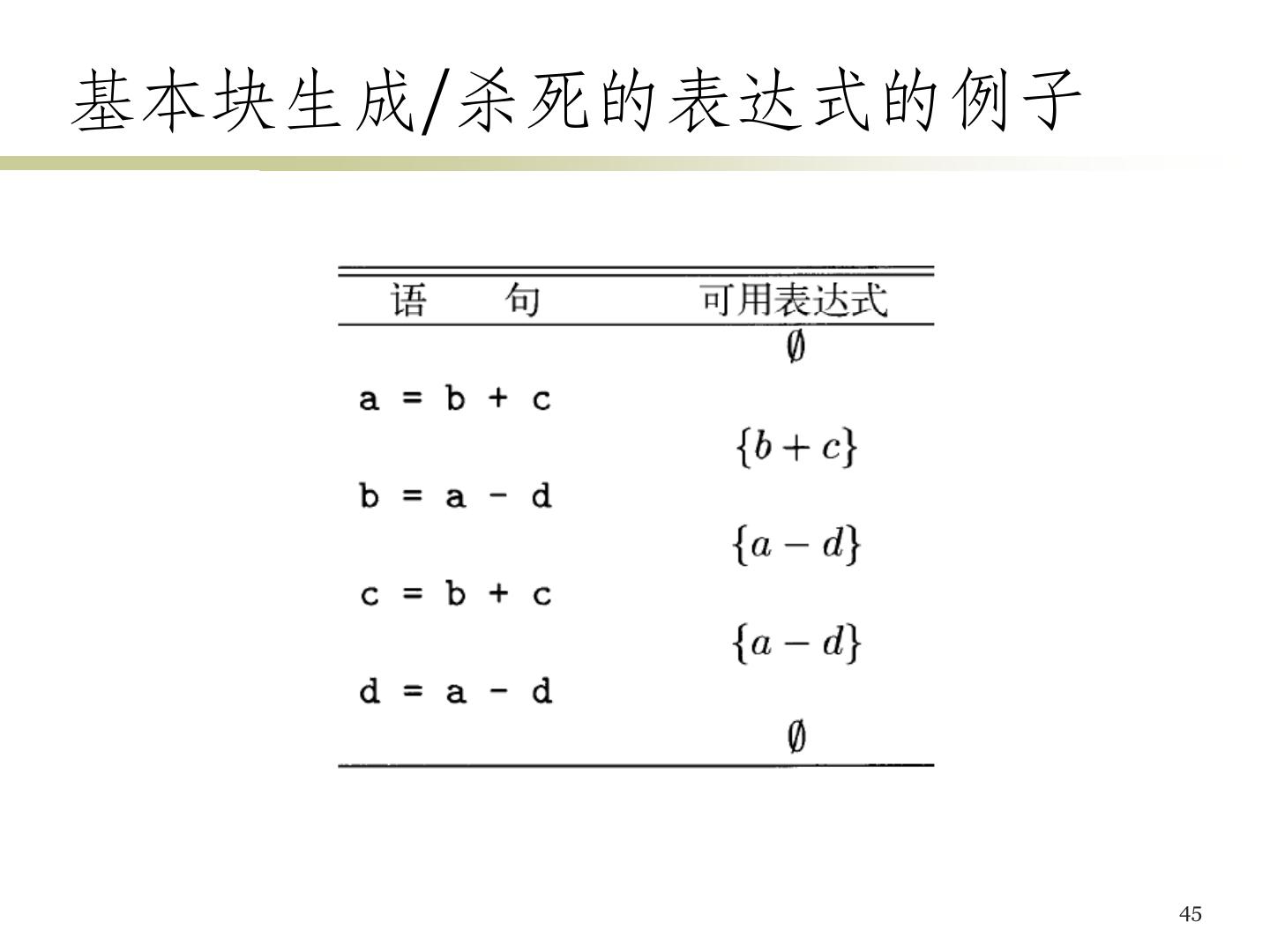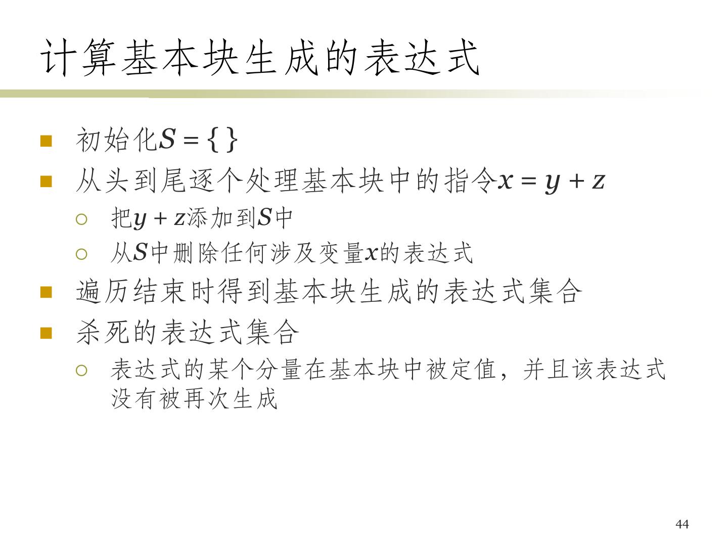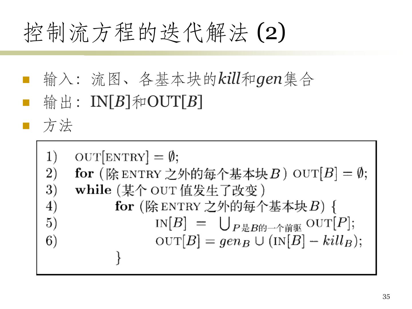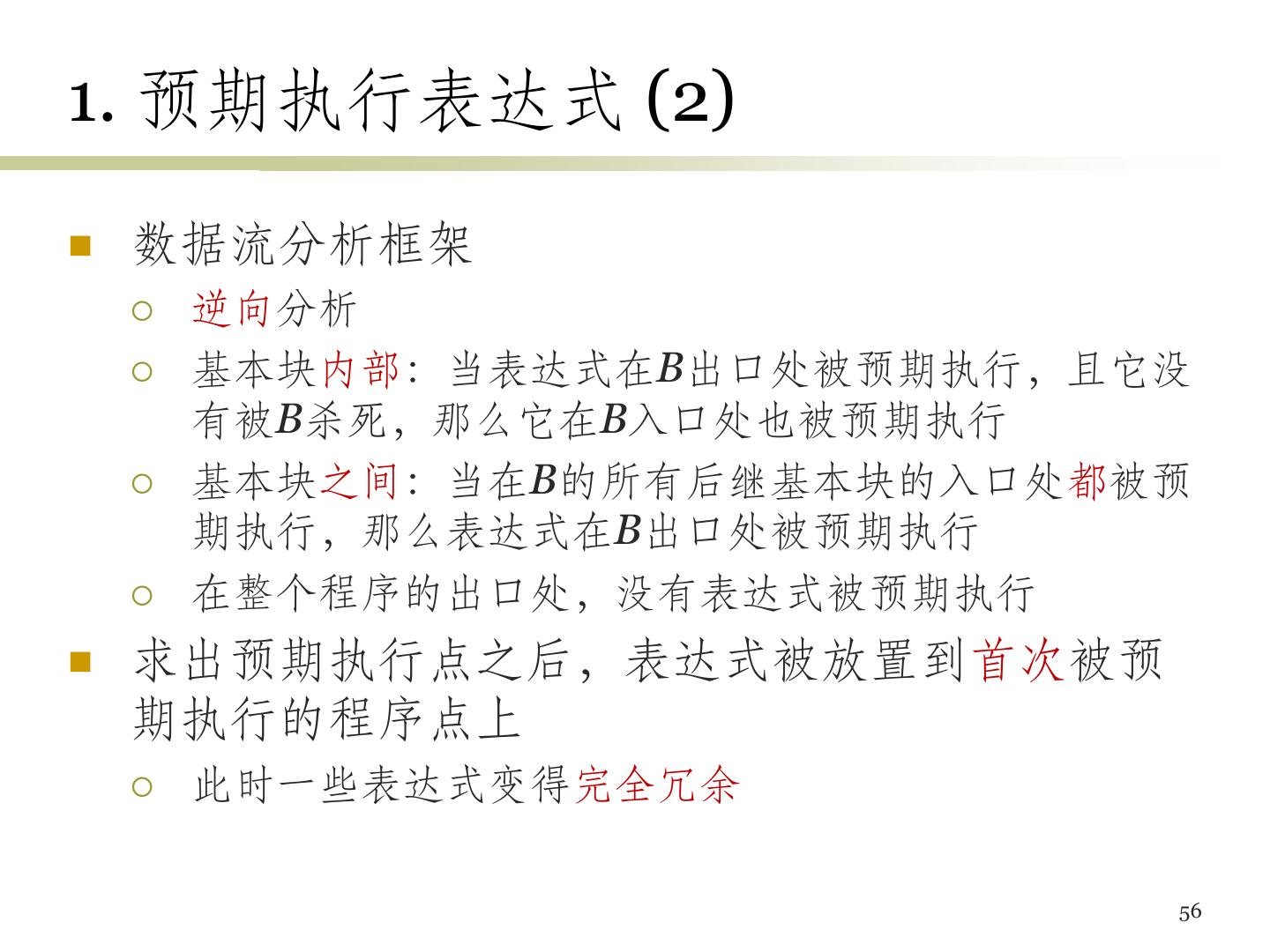 3 .引言 代码优化或者代码改进 在目标代码中消除不必要的指令 把一个指令序列替换为一个完成相同功能的更快的指 令序列 全局优化 具体的优化实现基于数据流分析技术 用以收集程序相关信息的算法 3