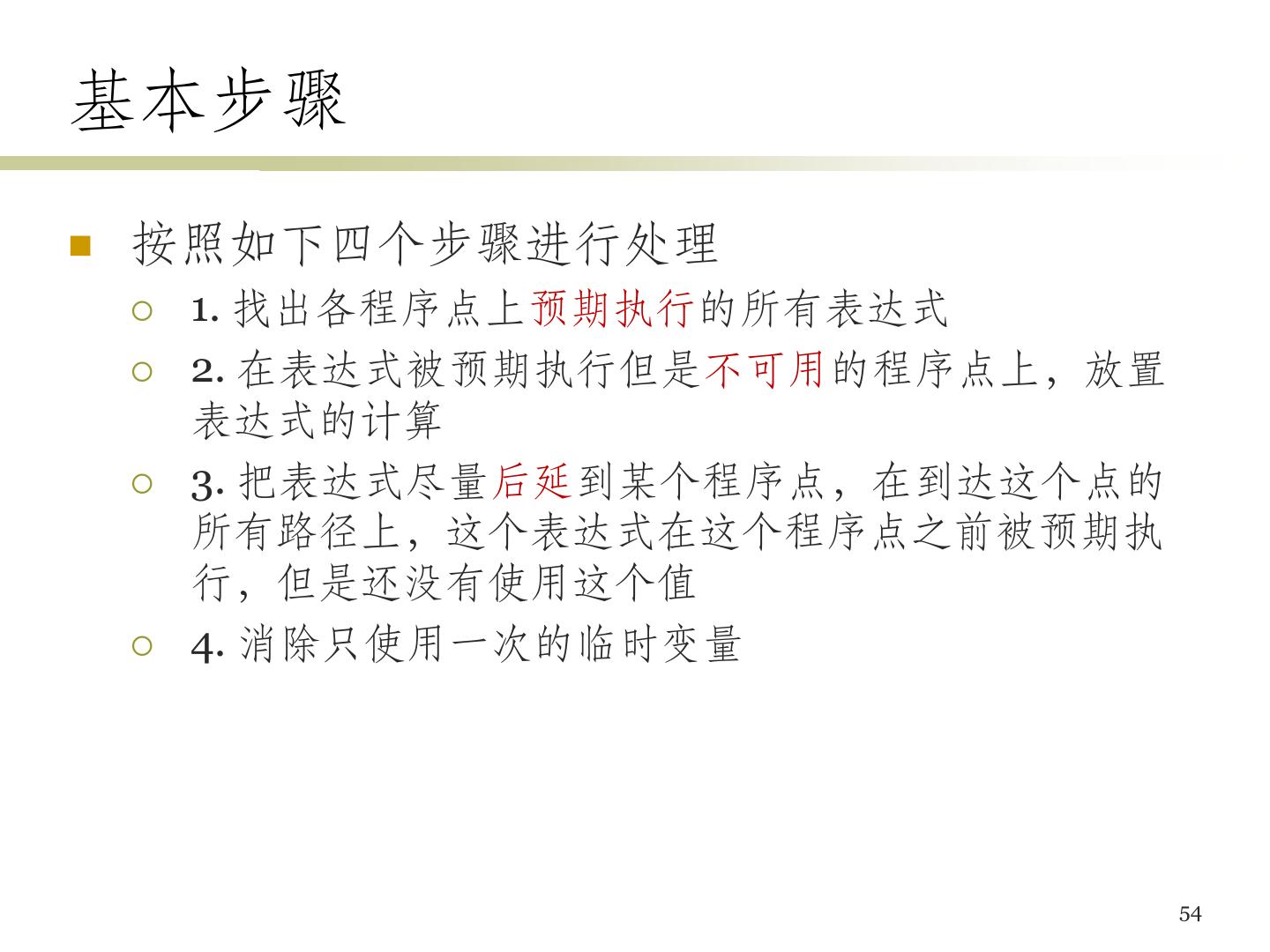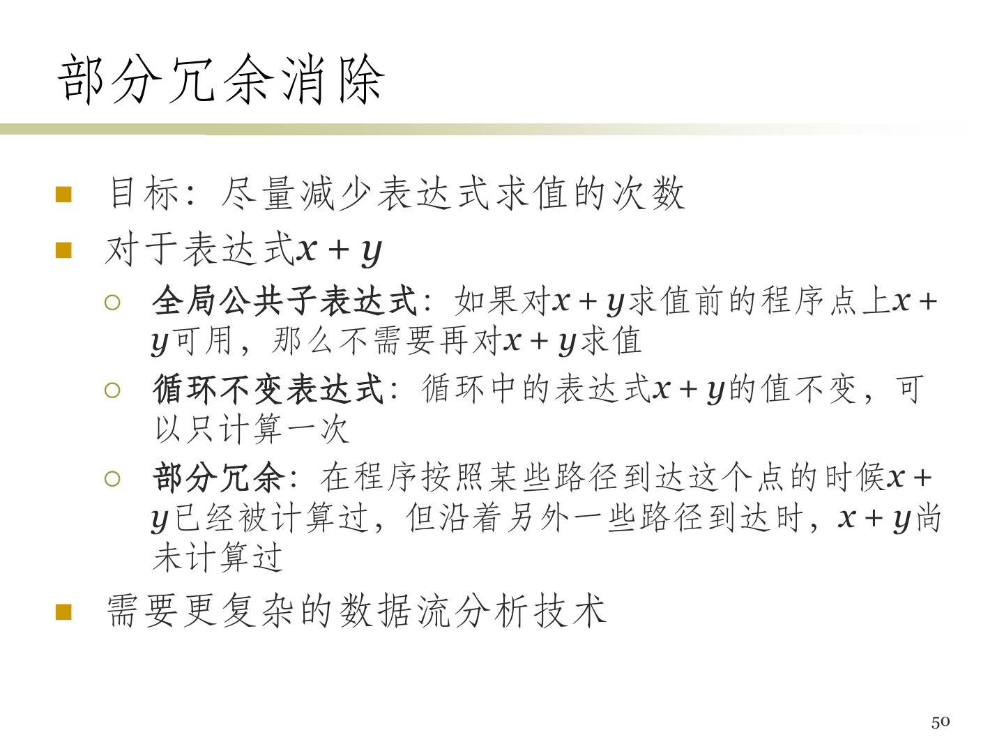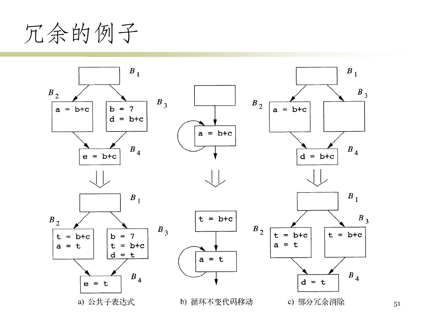 4 .优化的主要来源 编译器只能通过一些相对低层的语义等价转换来 优化代码 冗余运算的原因 源程序中的冗余 高级程序设计语言编程的副产品,比如"A[i][j].f = 0; A[i][j].k = 1;"中的冗余运算 语义不变的优化 公共子表达式消除 复制传播 死代码消除 常量折叠 4
