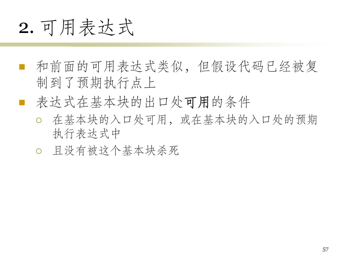 8 .全局公共子表达式 如果E 在某次出现之前必然已被计 算过,且 E的运算分量在该次计算之 后没有被改变 那么,E的本次出现就是一 个公共子表达式 t7 => t6 t10 => t8 如果上一次E的值赋给了x, 且x的值没有被修改过,那 例子: 么我们可以使用x,而不需 t7 = 4 * i 要计算E t10 = 4 * j 不需要重新计算 8