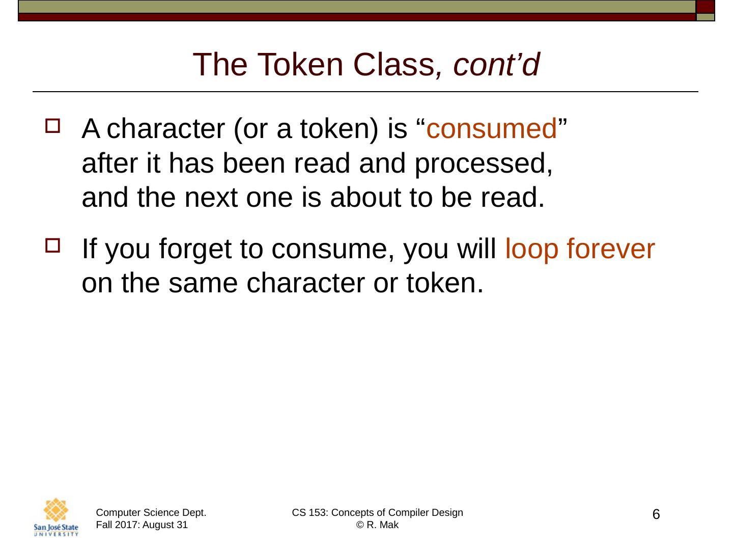 6 .6 The Token Class , cont’d A character (or a token) is “ consumed ” after it has been read and processed, and the next one is about to be read. If you forget to consume, you will loop forever on the same character or token.
