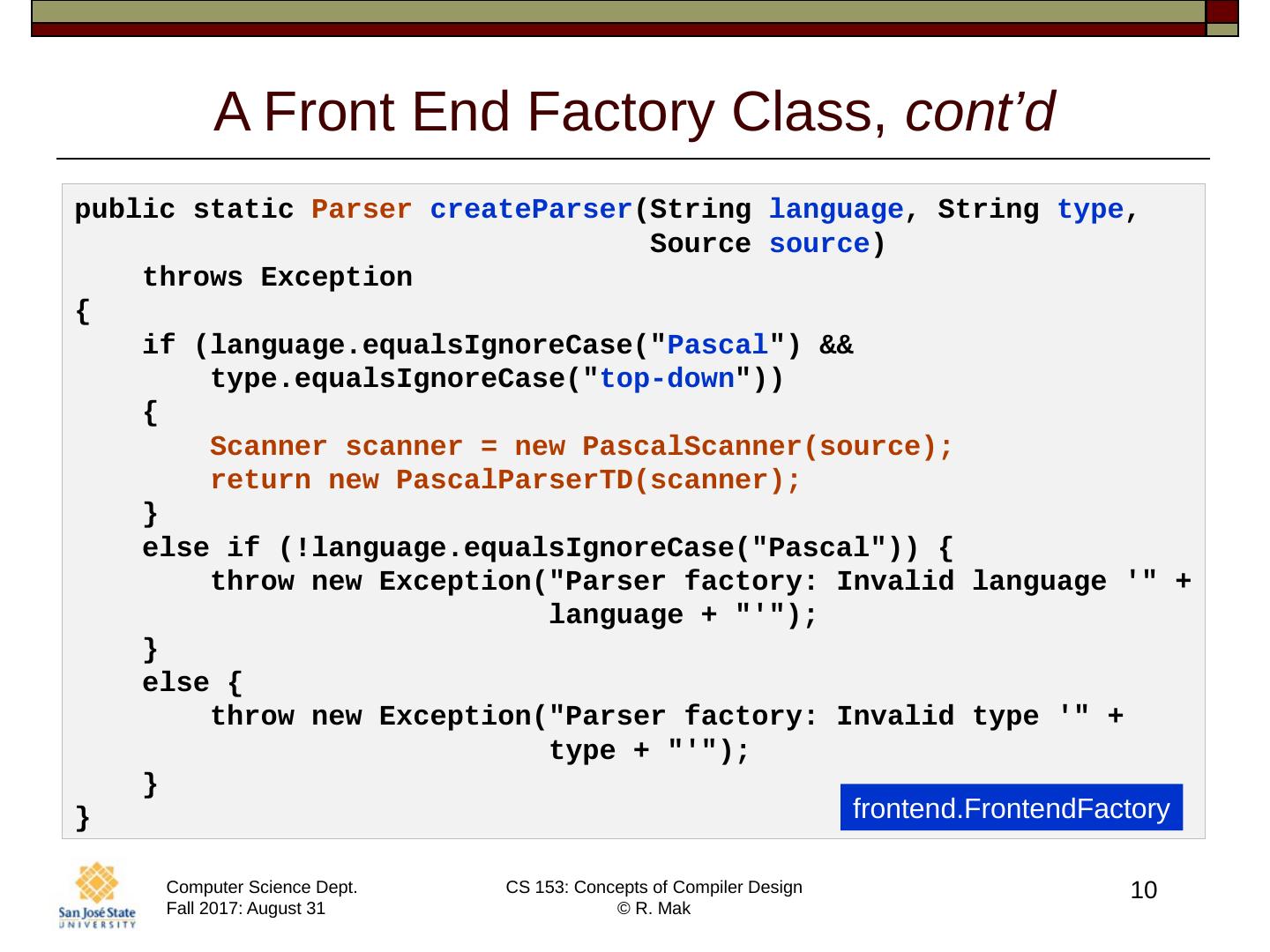 10 .10 A Front End Factory Class, cont ’ d public static Parser createParser (String language , String type , Source source ) throws Exception { if ( language.equalsIgnoreCase (" Pascal ") && type.equalsIgnoreCase (" top-down ")) { Scanner scanner = new PascalScanner (source); return new PascalParserTD (scanner); } else if (! language.equalsIgnoreCase ("Pascal")) { throw new Exception("Parser factory: Invalid language + language + "); } else { throw new Exception("Parser factory: Invalid type + type + "); } } frontend.FrontendFactory