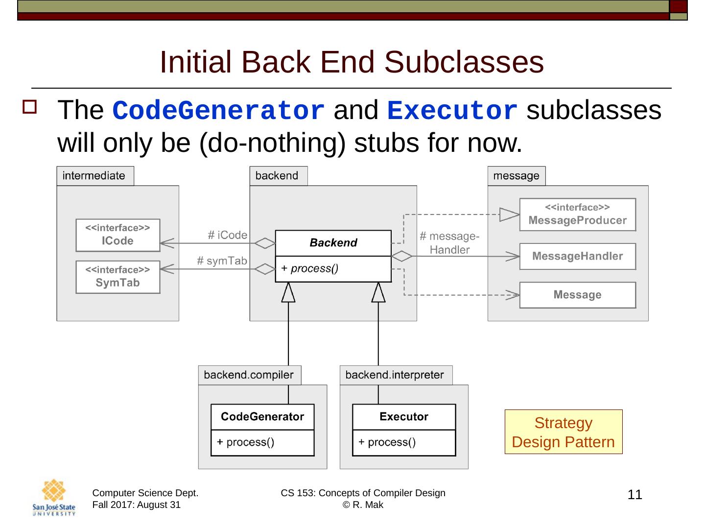 11 .11 Initial Back End Subclasses The CodeGenerator and Executor subclasses will only be (do-nothing) stubs for now. Strategy Design Pattern