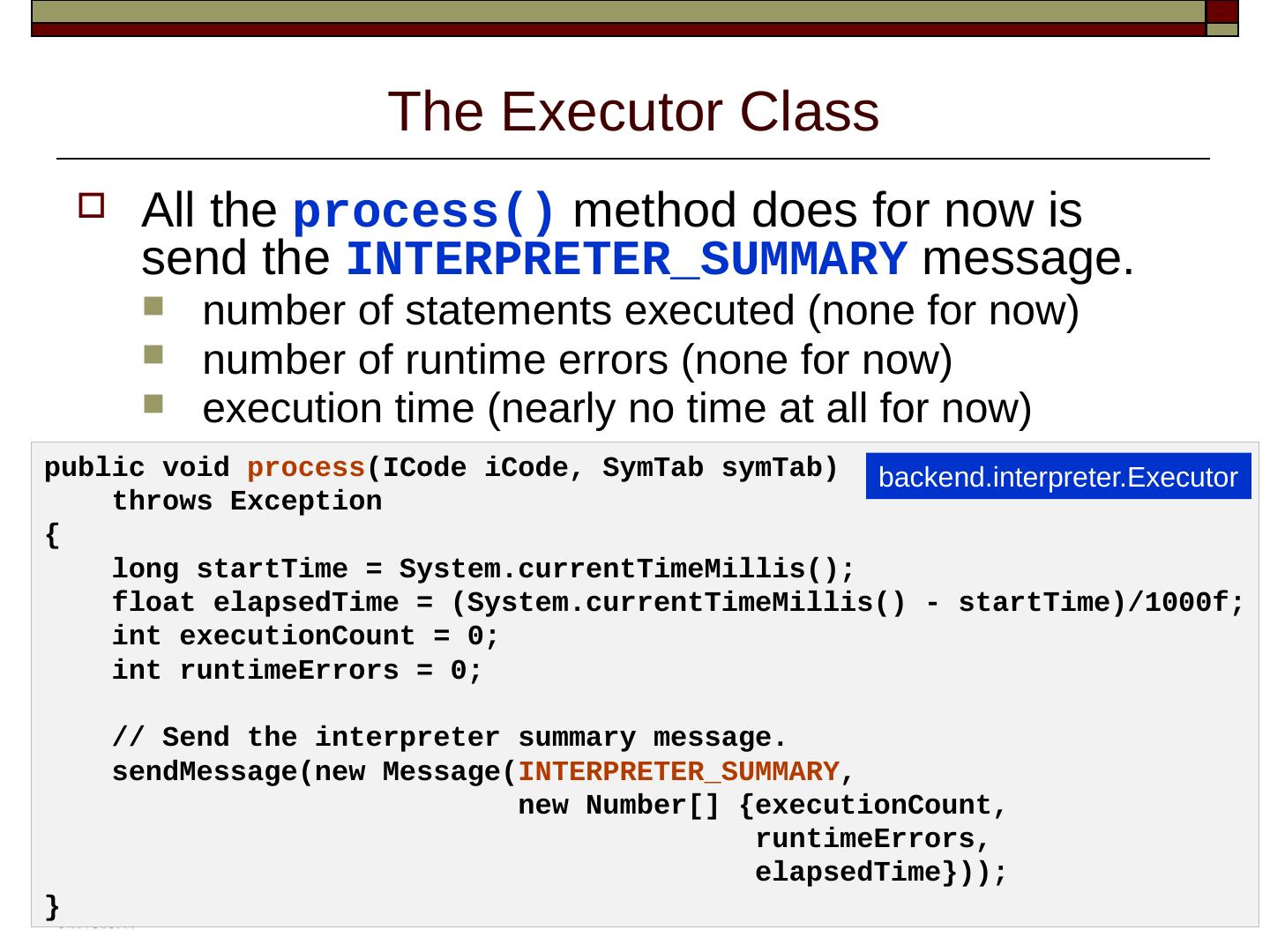 13 .13 The Executor Class All the process() method does for now is send the INTERPRETER_SUMMARY message. number of statements executed (none for now) number of runtime errors (none for now) execution time (nearly no time at all for now) public void process ( ICode iCode , SymTab symTab ) throws Exception { long startTime = System.currentTimeMillis (); float elapsedTime = ( System.currentTimeMillis () - startTime )/1000f; int executionCount = 0; int runtimeErrors = 0; // Send the interpreter summary message. sendMessage (new Message( INTERPRETER_SUMMARY , new Number[] { executionCount , runtimeErrors , elapsedTime })); } backend.interpreter.Executor