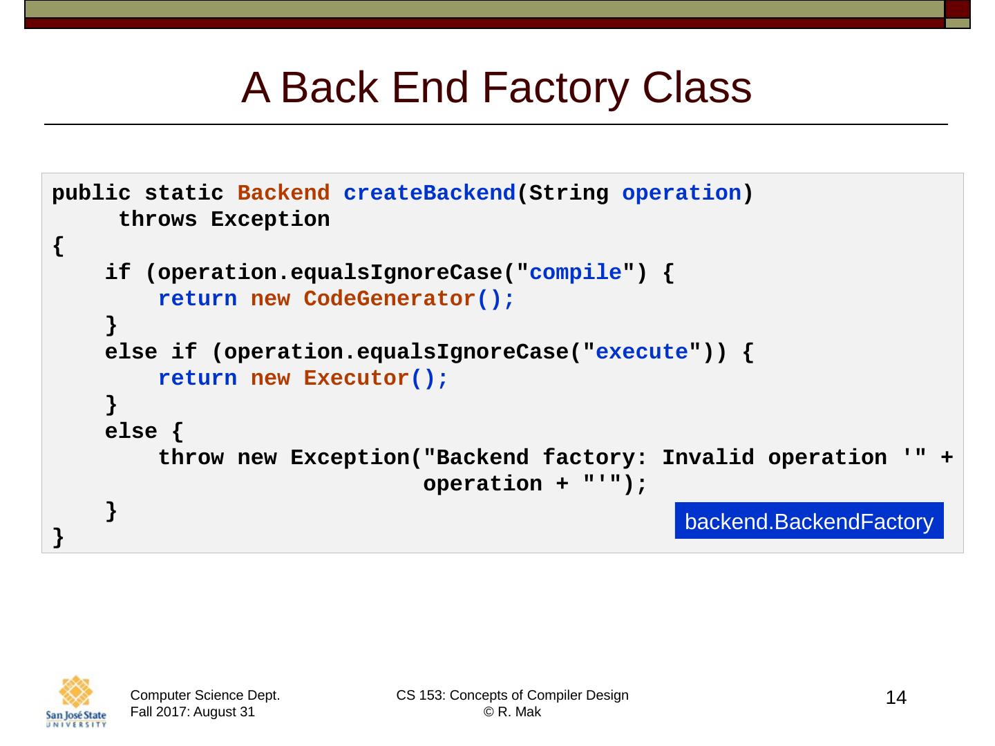 14 .14 A Back End Factory Class public static Backend createBackend (String operation ) throws Exception { if ( operation.equalsIgnoreCase (" compile ") { return new CodeGenerator (); } else if ( operation.equalsIgnoreCase (" execute ")) { return new Executor (); } else { throw new Exception("Backend factory: Invalid operation + operation + "); } } backend.BackendFactory