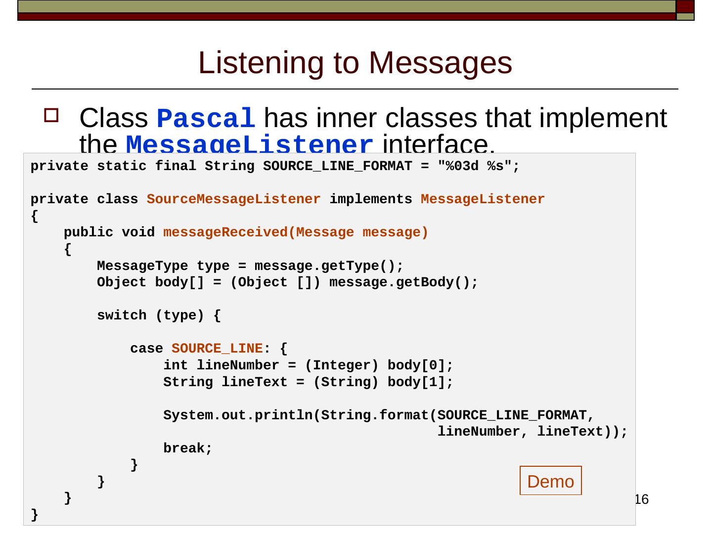 16 .16 Listening to Messages Class Pascal has inner classes that implement the MessageListener interface. private static final String SOURCE_LINE_FORMAT = "%03d %s"; private class SourceMessageListener implements MessageListener { public void messageReceived (Message message) { MessageType type = message.getType (); Object body[] = (Object []) message.getBody (); switch (type) { case SOURCE_LINE : { int lineNumber = (Integer) body[0]; String lineText = (String) body[1]; System.out.println ( String.format (SOURCE_LINE_FORMAT, lineNumber , lineText )); break; } } } } Demo