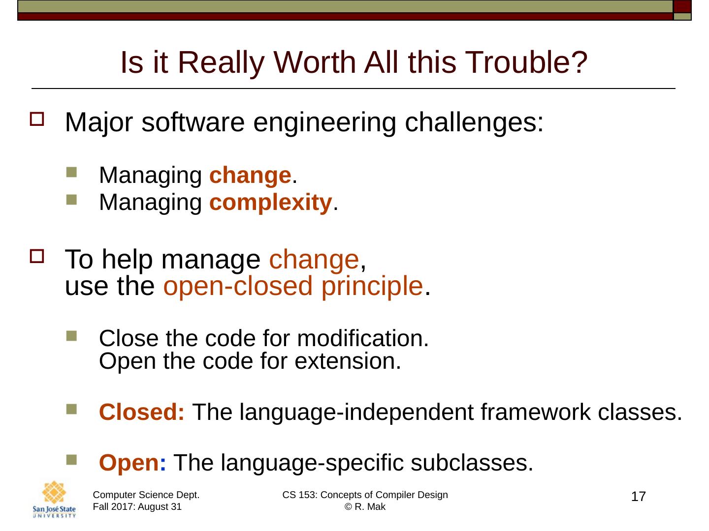 17 .17 Is it Really Worth All this Trouble? Major software engineering challenges: Managing change . Managing complexity . To help manage change , use the open-closed principle . Close the code for modification. Open the code for extension. Closed: The language-independent framework classes. Open : The language-specific subclasses.