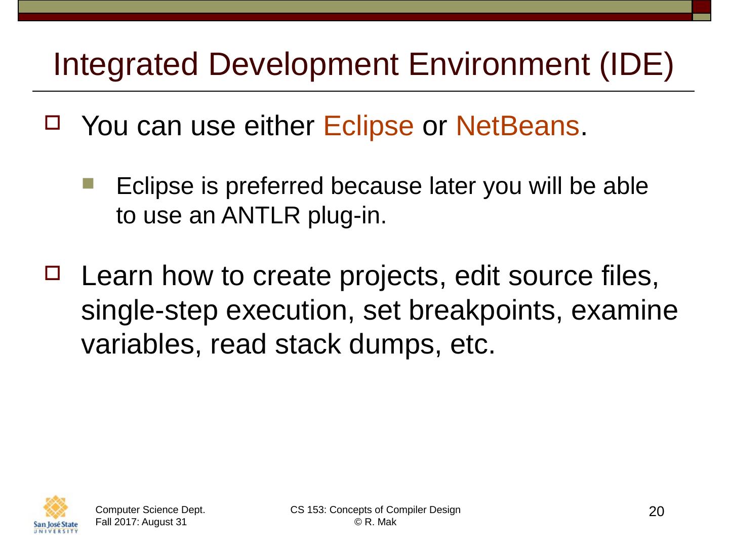 20 .20 Integrated Development Environment (IDE) You can use either Eclipse or NetBeans . Eclipse is preferred because later you will be able to use an ANTLR plug-in. Learn how to create projects, edit source files, single-step execution, set breakpoints, examine variables, read stack dumps, etc.