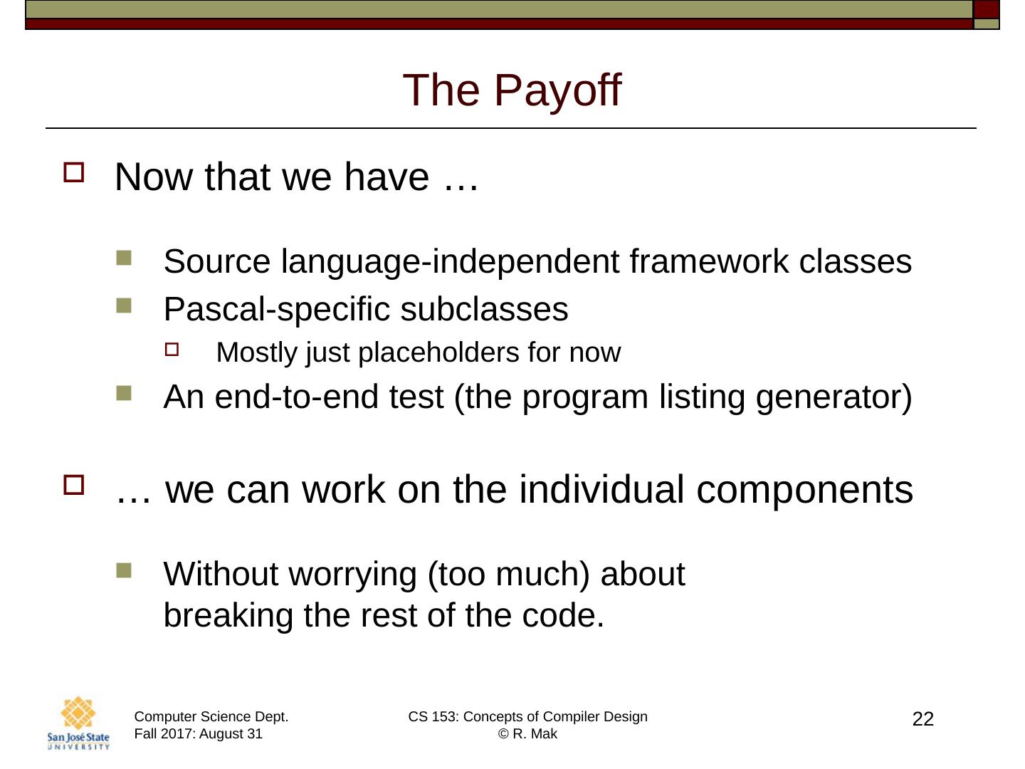 22 .22 The Payoff Now that we have … Source language-independent framework classes Pascal-specific subclasses Mostly just placeholders for now An end-to-end test (the program listing generator) … we can work on the individual components Without worrying (too much) about breaking the rest of the code.