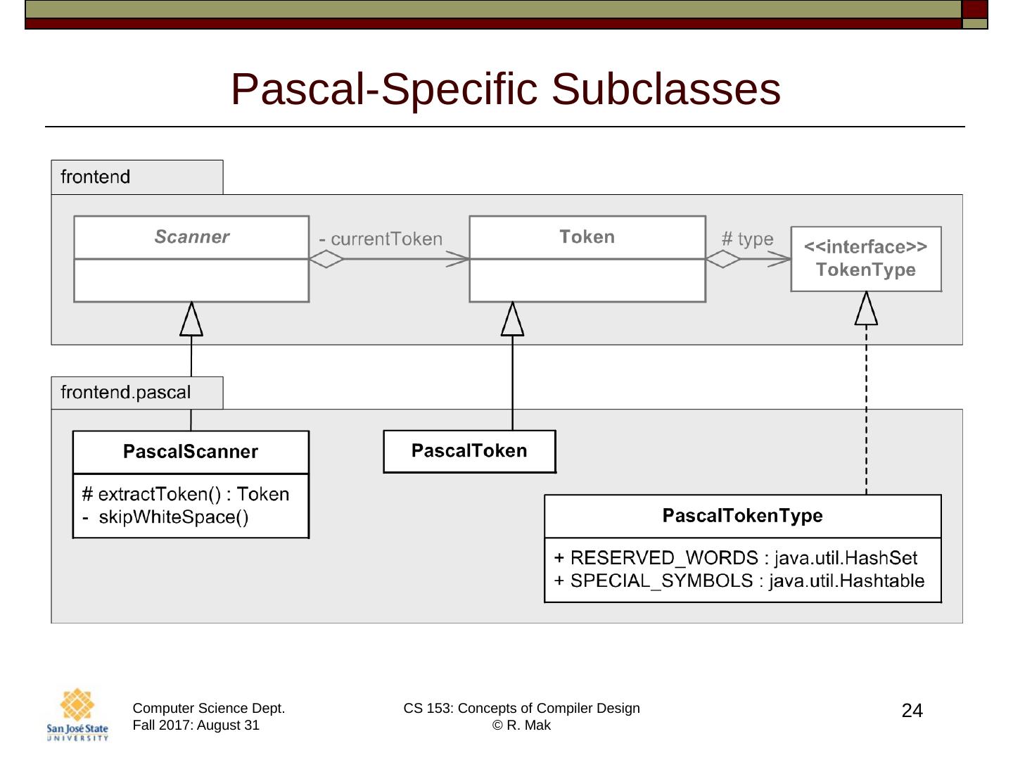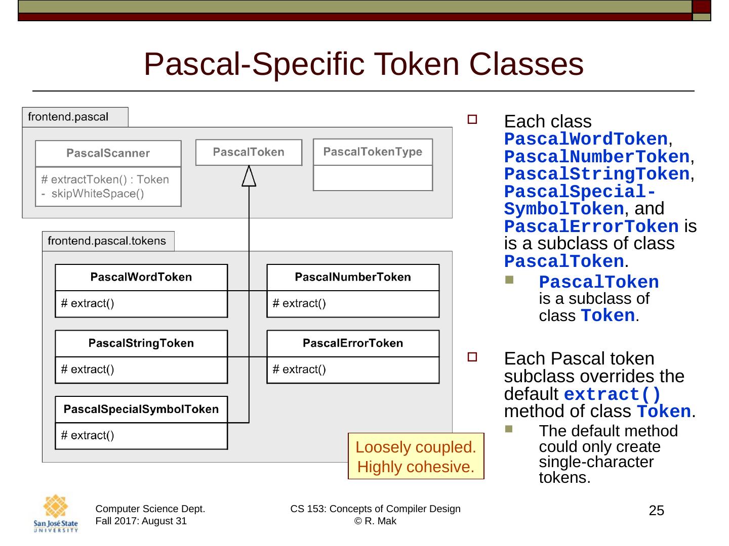 25 .25 Pascal-Specific Token Classes Each class PascalWordToken , PascalNumberToken , PascalStringToken , PascalSpecial-SymbolToken , and PascalErrorToken is is a subclass of class PascalToken . PascalToken is a subclass of class Token . Each Pascal token subclass overrides the default extract() method of class Token . The default method could only create single-character tokens. Loosely coupled. Highly cohesive.