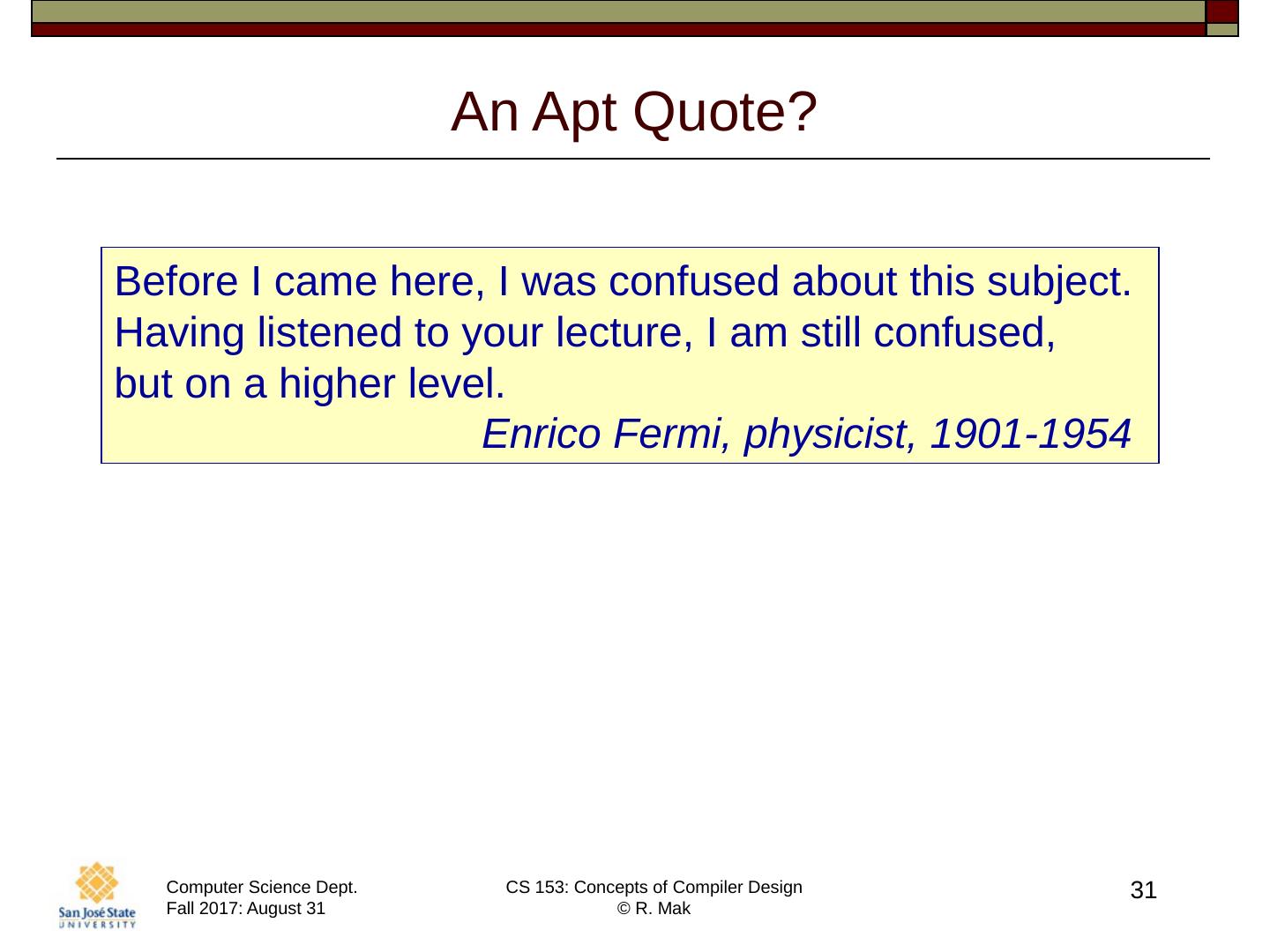 1 .CS 153: Concepts of Compiler Design August 31 Class Meeting Department of Computer Science San Jose State University Fall 2017 Instructor: Ron Mak www.cs.sjsu.edu/~mak 1