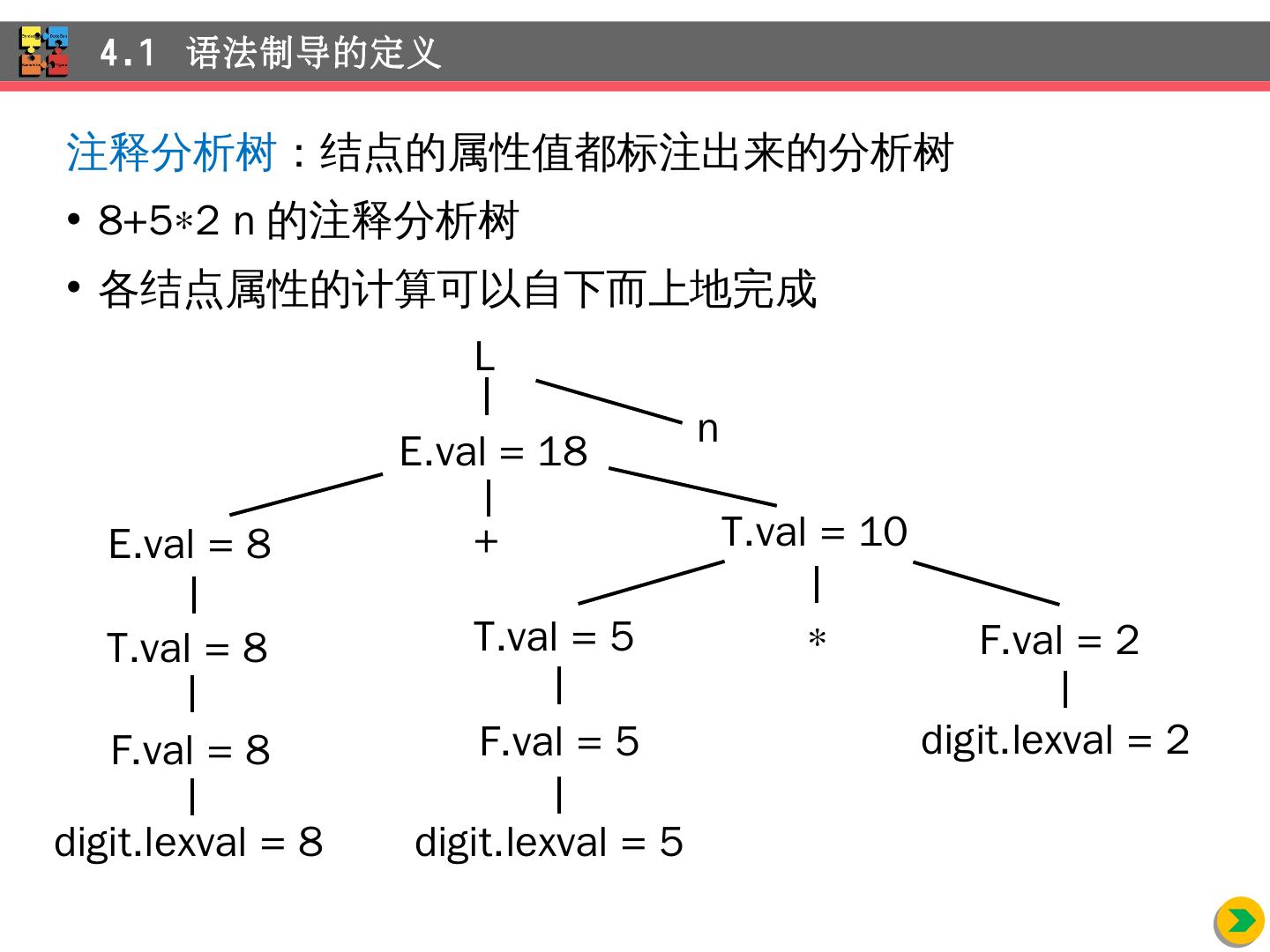 7 .注释 分析树 : 结点 的属性值都标注出来的分析树 8+5 2 n 的注释分析树 各 结点属性的计算可以自下而上地 完成 4.1 语法制导的定义 digit.lexval = 2 E.val = 18 T.val = 10 E.val = 8 T.val = 8 F.val = 8 digit.lexval = 8 T.val = 5 F.val = 5 F.val = 2 digit.lexval = 5 L n +