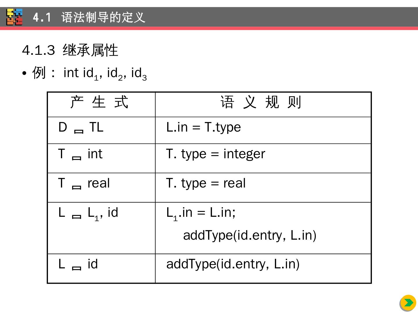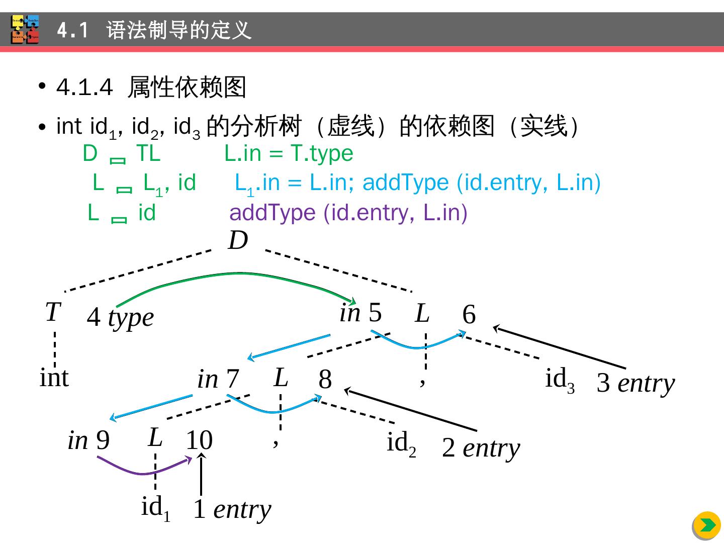 8 .4.1.3 继承属性 例: int id 1 , id 2 , id 3 4.1 语法制导的定义 产 生 式 语 义 规 则 D TL L.in = T.type T int T. type = integer T real T. type = real L L 1 , id L 1 .in = L.in; addType(id.entry, L.in) L id addType ( id.entry , L.in)