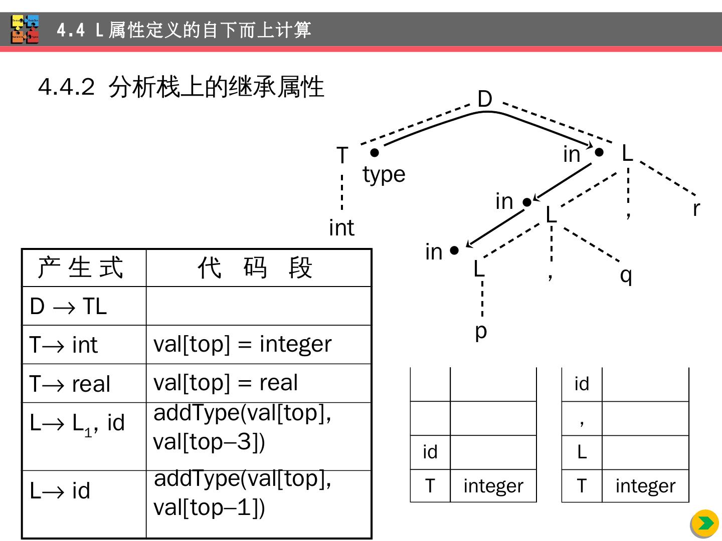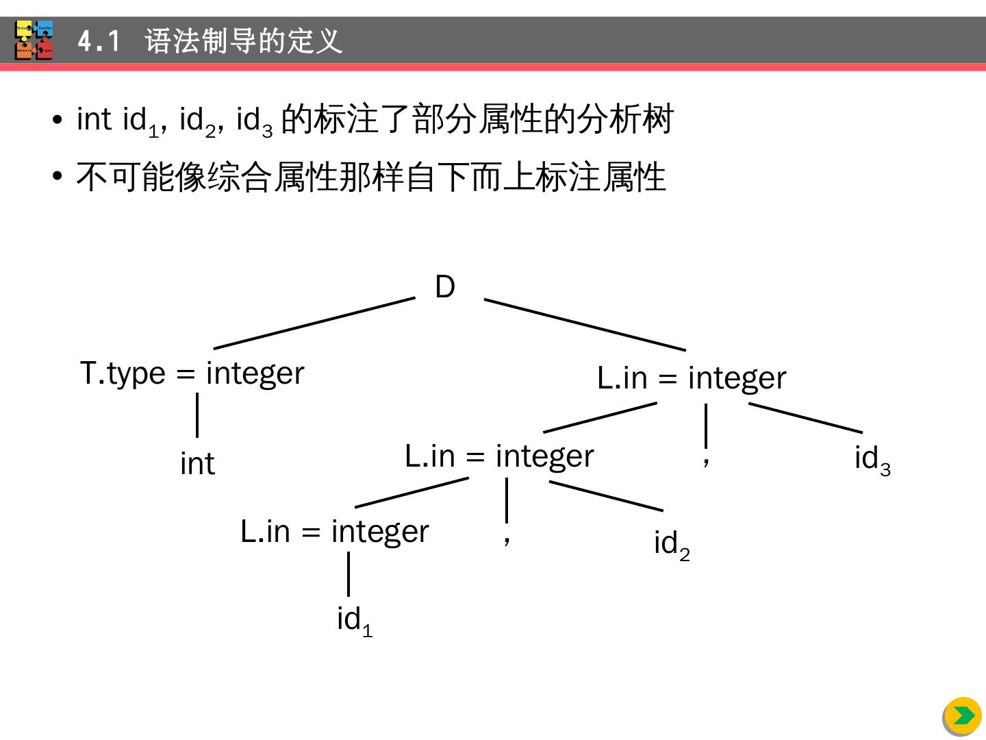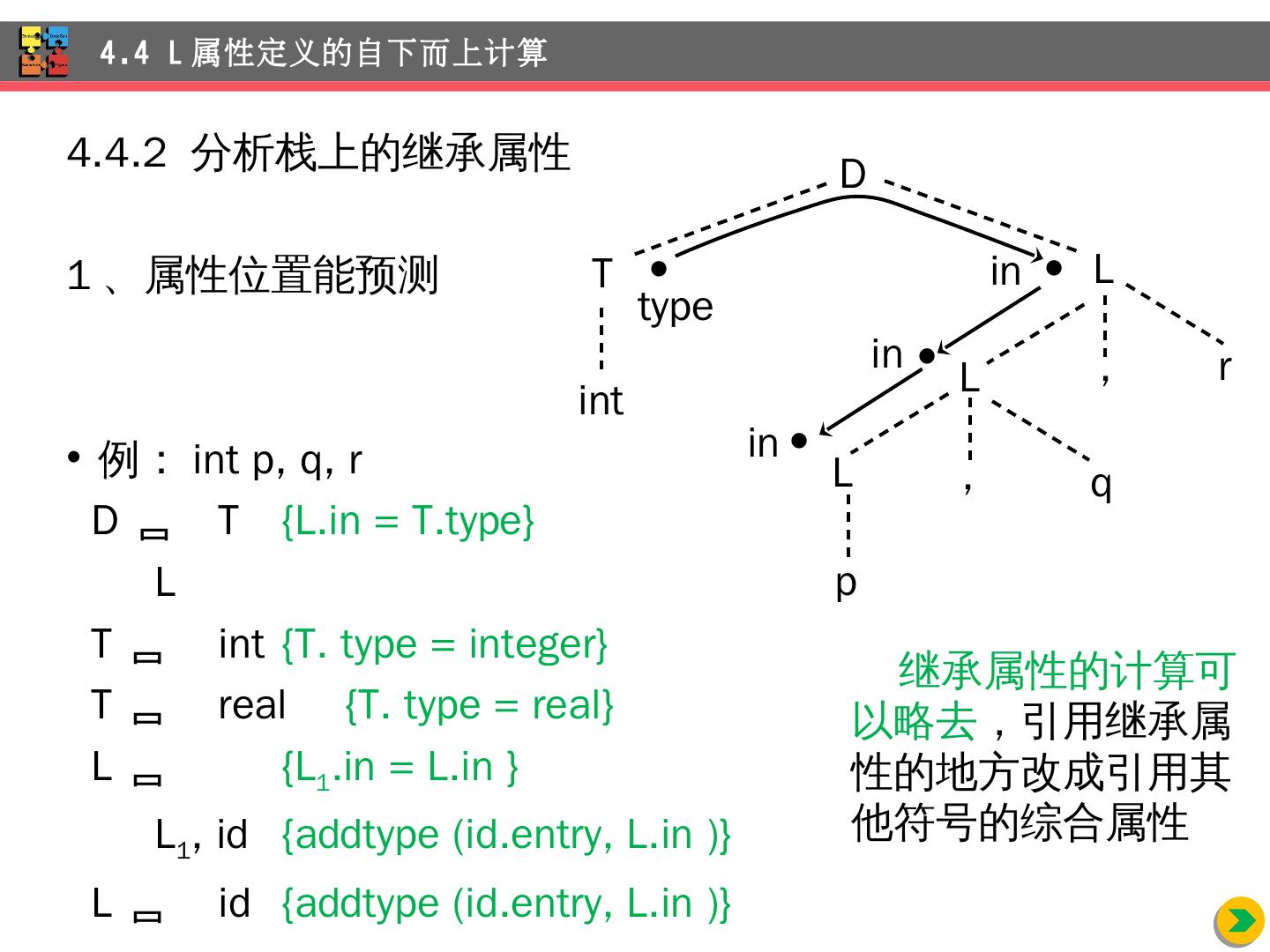 9 .int id 1 , id 2 , id 3 的标注了部分属性的分析树 不可能像 综合属性那样自下而上标注属性 4.1 语法制导的定义 D int T.type = integer , id 3 L.in = integer L.in = integer L.in = integer id 2 id 1 ,