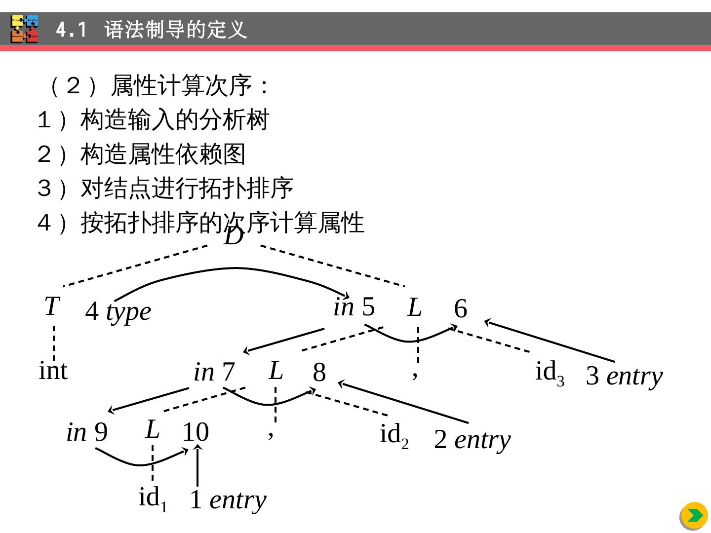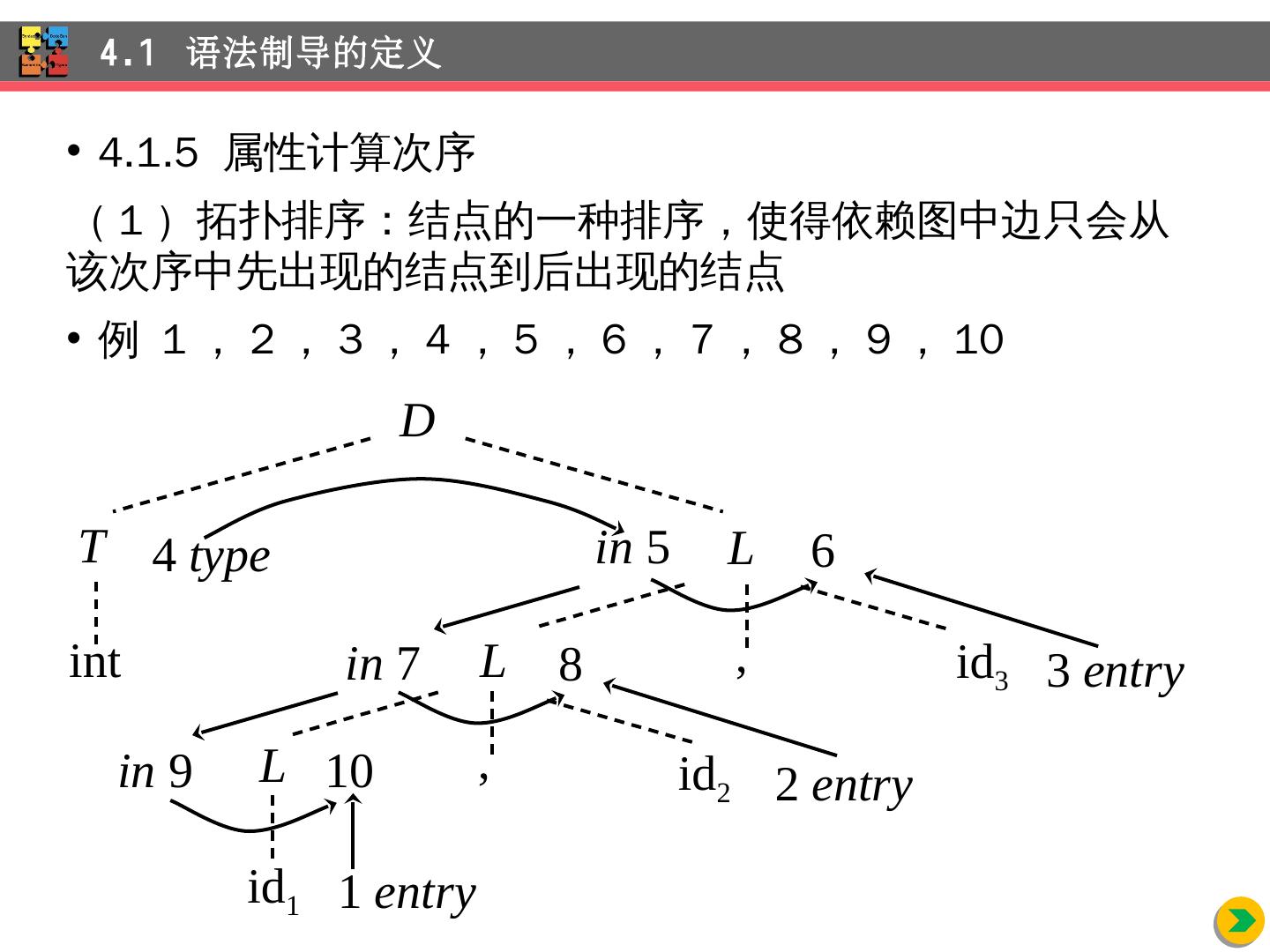 10 .4.1.4 属性依赖图 int id 1 , id 2 , id 3 的分析树(虚线)的依赖图(实线) 4.1 语法制导的定义 D int T , id 3 L L L id 2 id 1 , 1 entry 10 2 entry 3 entry in 9 8 in 7 6 in 5 4 type D TL L.in = T.type L L 1 , id L 1 .in = L.in ; addType ( id.entry , L.in) L id addType ( id.entry , L.in)