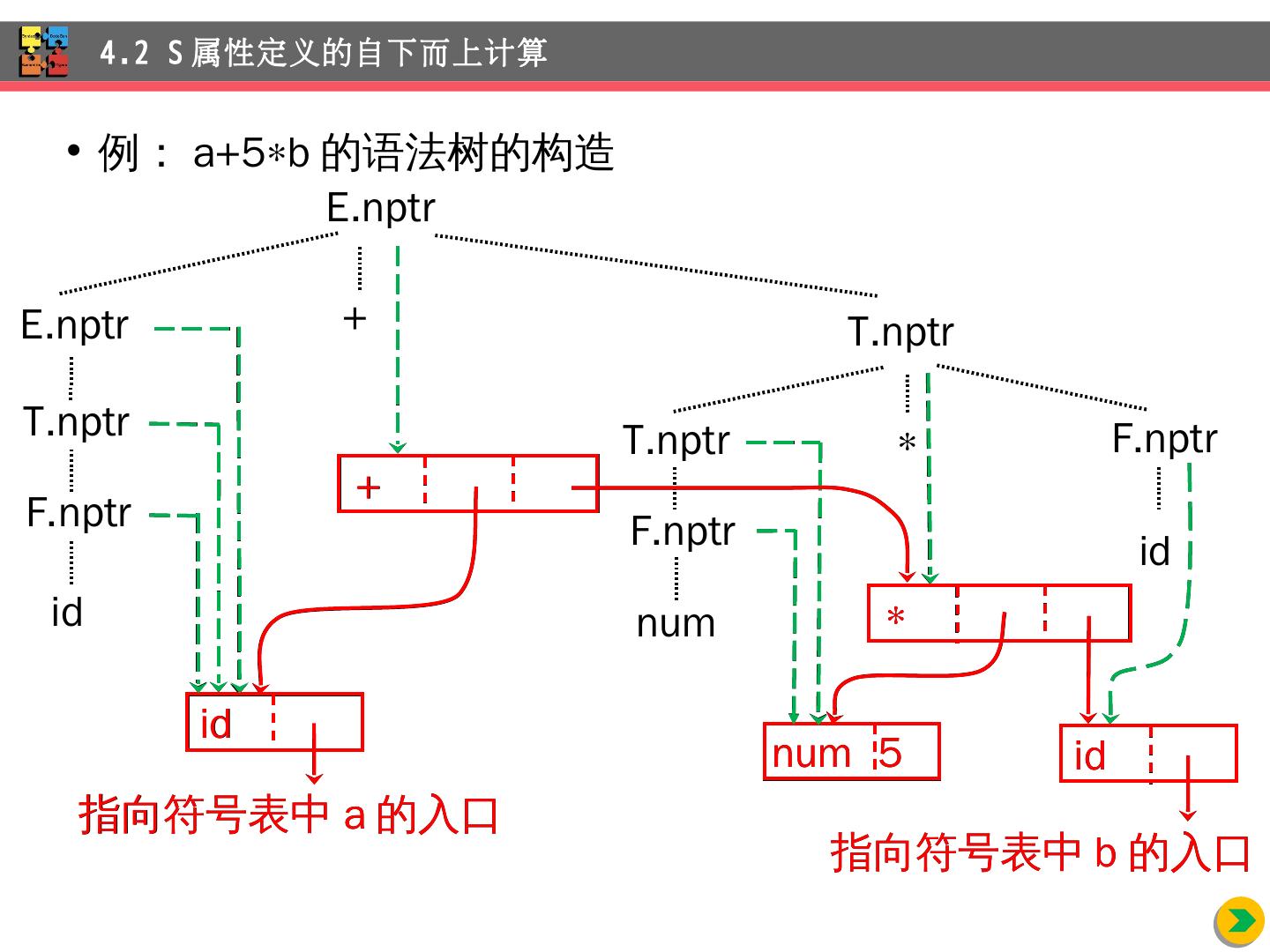 17 .例: a+5 b 的语法树的构造 4.2 S 属性定义的自下而上计算 E.nptr T.nptr E.nptr T.nptr F.nptr id T.nptr + F.nptr F.nptr id num id id num 5 + 指向符号表中 a 的入口 指向符号表中 b 的入口 id 指向符号表中 a 的入口 num 5 id 指向符号表中 b 的入口 +