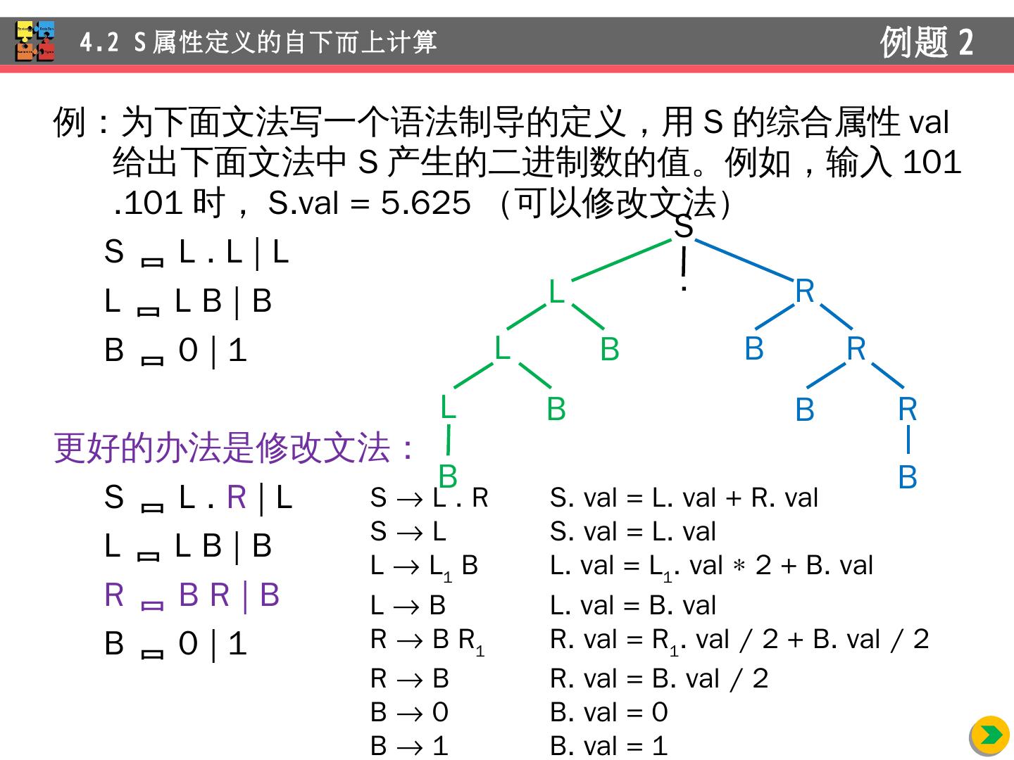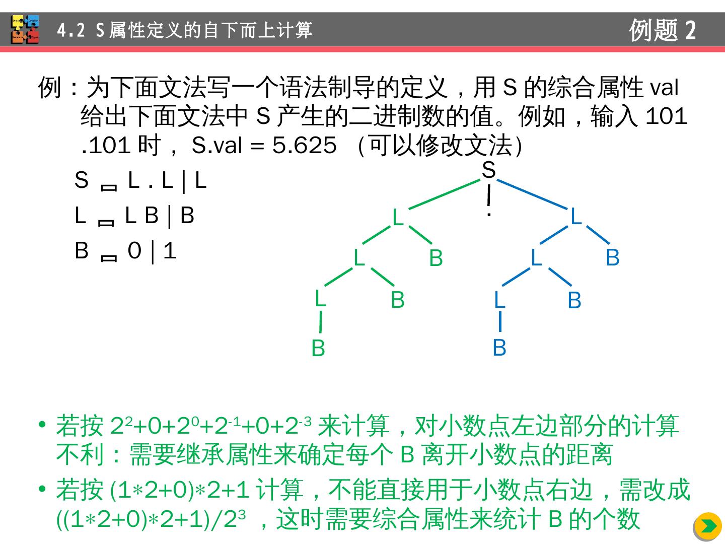 21 .例:为 下面文法写一个语法制导的定义,用 S 的综合属性 val 给 出下面文法中 S 产生的二进制数的值。例如, 输入 101.101 时, S.val = 5.625 (可以修改文法 ) S L . L | L L L B | B B 0 | 1 若 按 2 2 +0+2 0 +2 -1 +0+2 -3 来计算 ,对小数点左边 部分的计算 不利:需要 继承属性来确定每个 B 离开 小数点的距离 若按 ( 1 2+0) 2+1 计算,不能直接 用于小数点右边,需改成 (( 1 2+0) 2+1 )/2 3 ,这时 需要综合属性来统计 B 的 个数 4.2 S 属性定义的自下而上计算 例题 2 S . L L B L B B L L B L B B