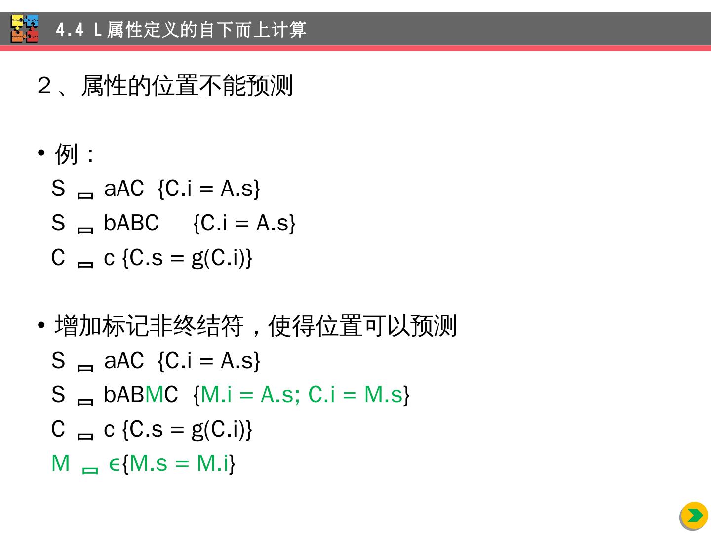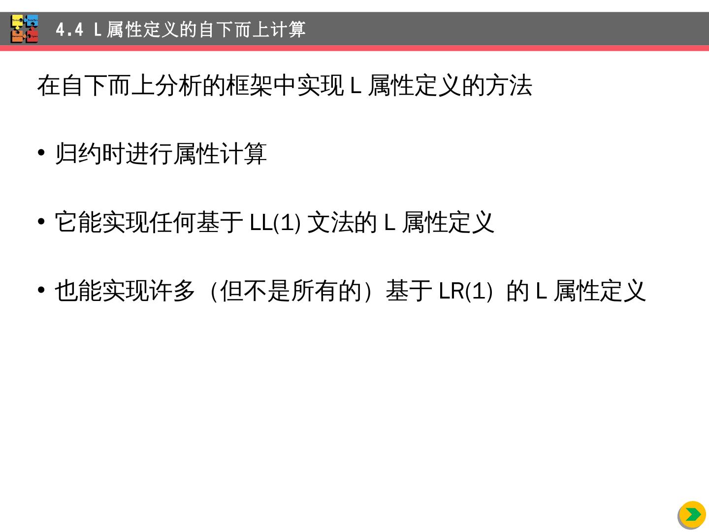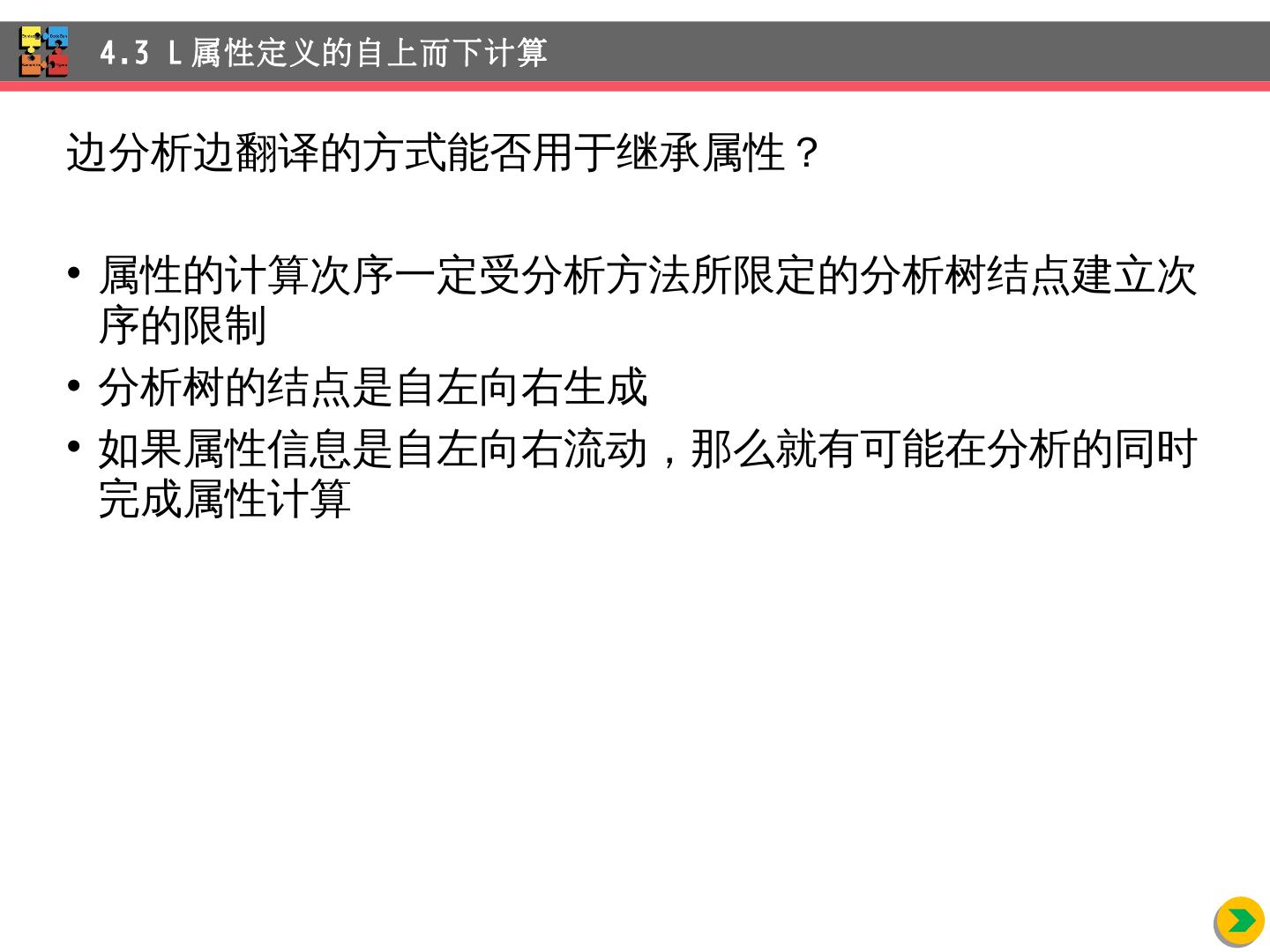 24 .边分析边翻译的方式能否用于继承属性? 属性的计算次序一定受分析方法所限定的分析树结点建立次序的限制 分析树的结点是自左向右生成 如果属性信息是自左向右流动,那么就有可能在分析的同时完成属性计算 4.3 L 属性 定义的 自上而下计算