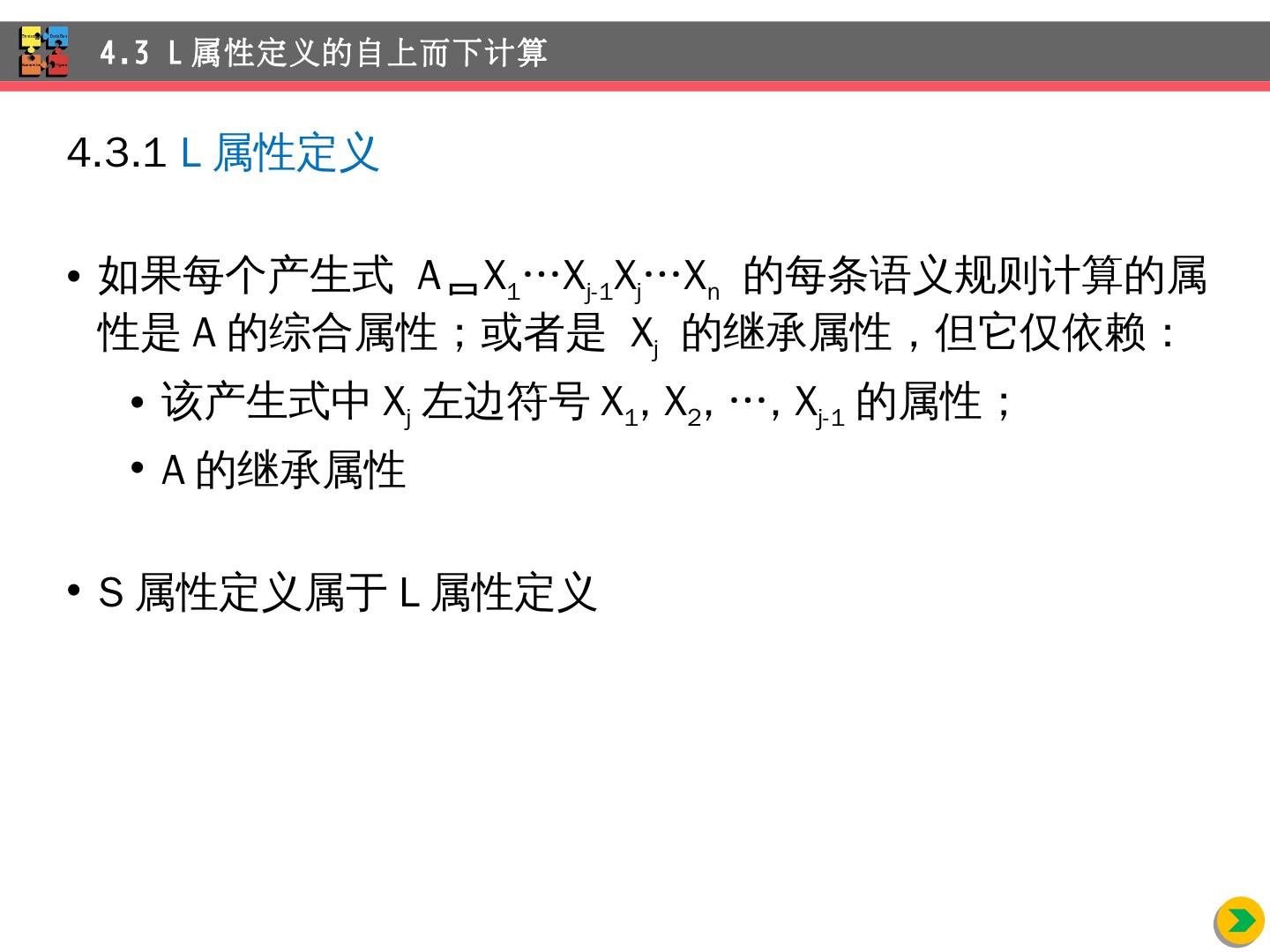 25 .4.3.1 L 属性定义 如果每个产生 式 A X 1 …X j-1 X j … X n 的 每条语义规则计算的属性是 A 的综合属性;或者 是 X j 的继承属性,但它仅依赖: 该产生式中 X j 左边符号 X 1 , X 2 , …, X j-1 的属性; A 的继承属性 S 属性定义属于 L 属性定义 4.3 L 属性 定义的自上而下计算