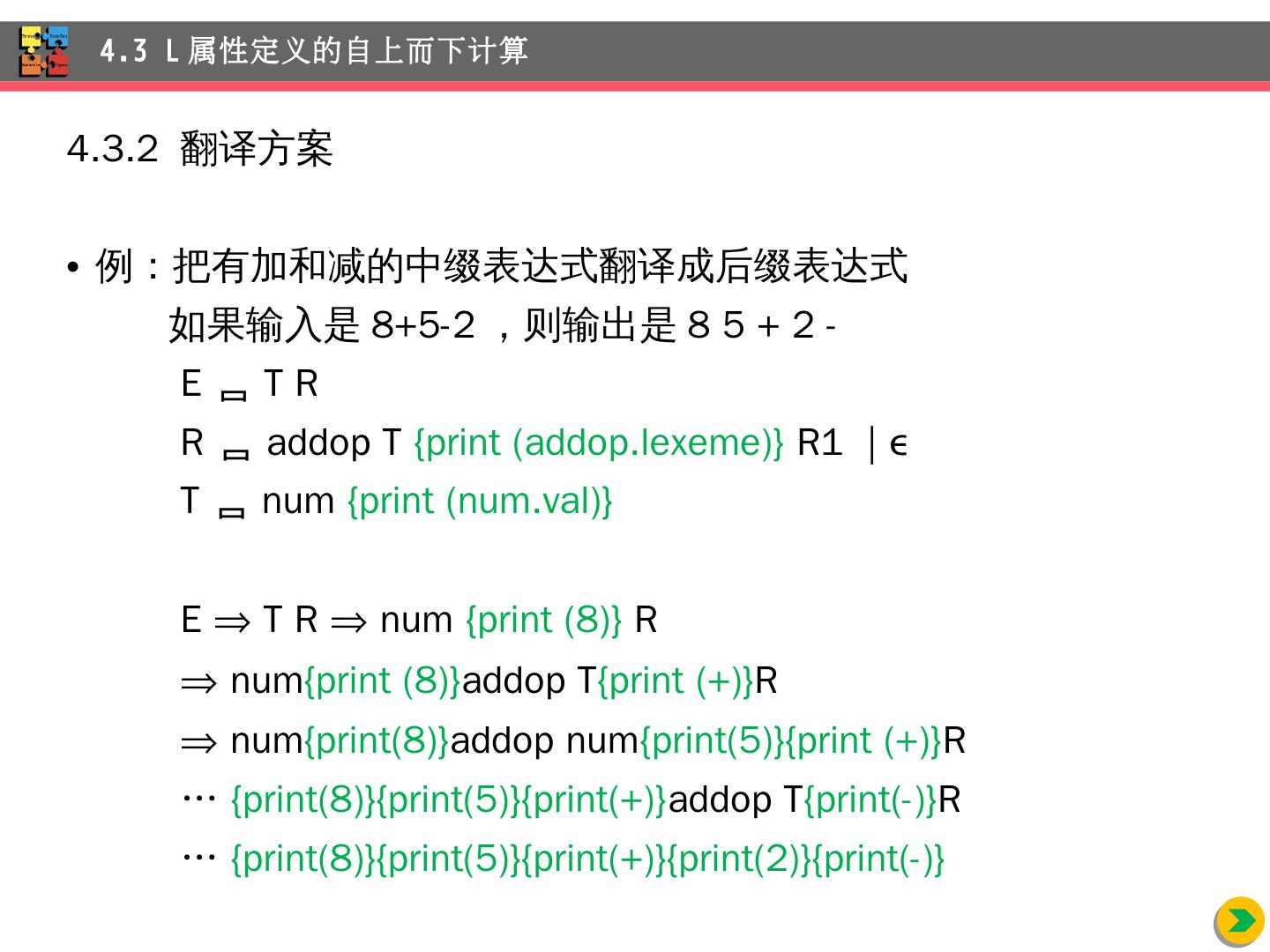 27 .4.3.2 翻译 方案 例:把 有加和减的中缀表达式翻译成后缀表达式 如果 输入是 8+5-2 ,则输出是 8 5 + 2 - E T R R addop T {print ( addop.lexeme )} R1 | ε T num {print ( num.val )} E T R num {print (8)} R num {print (8)} addop T {print (+)} R num {print(8)} addop num {print(5)}{print (+)} R … {print(8)}{print(5)}{print(+)} addop T {print (-)} R … {print(8)}{print(5)}{print(+)}{print(2)}{print (-)} 4.3 L 属性 定义的自上而下计算