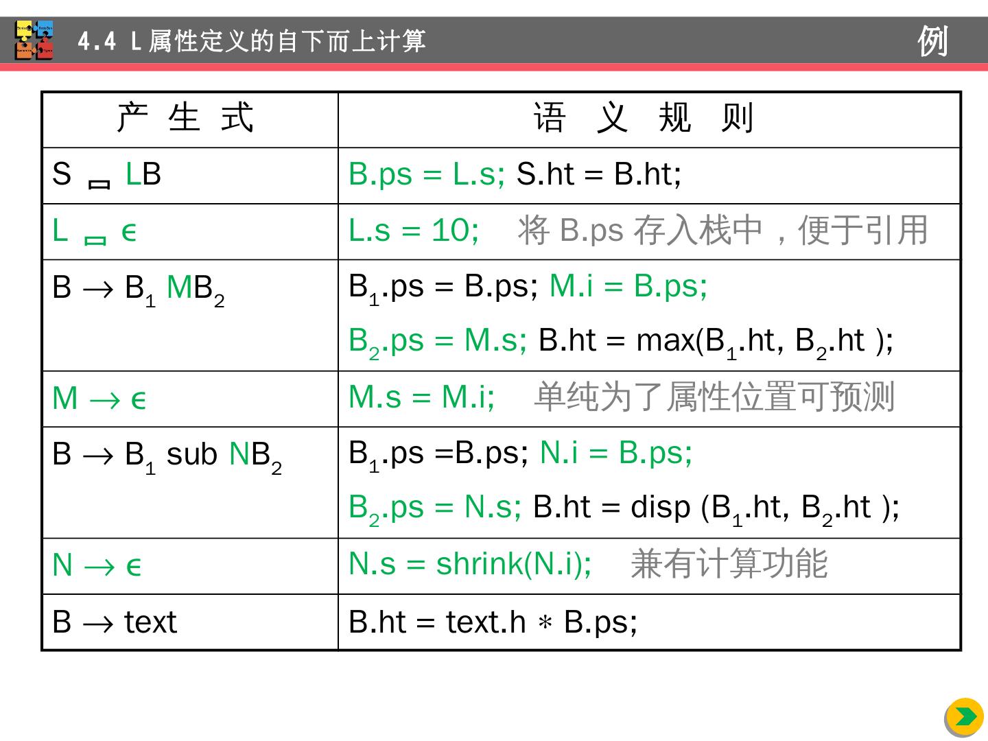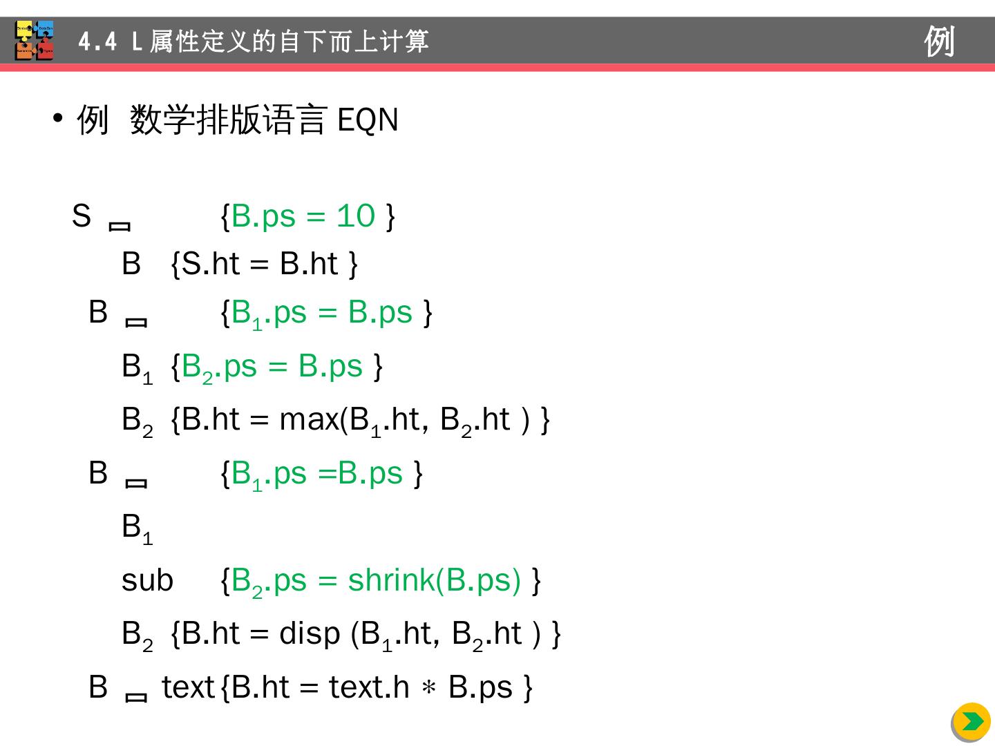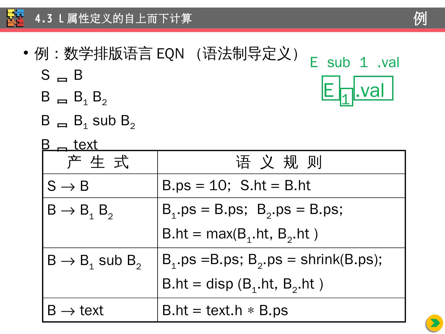 28 .例:数学 排版语言 EQN (语法 制导 定义) S B B B 1 B 2 B B 1 sub B 2 B text 4.3 L 属性 定义的自上而下计算 例 产 生 式 语 义 规 则 S B B.ps = 10; S.ht = B.ht B B 1 B 2 B 1 .ps = B.ps; B 2 .ps = B.ps; B.ht = max(B 1 .ht, B 2 .ht ) B B 1 sub B 2 B 1 .ps =B.ps; B 2 .ps = shrink(B.ps); B.ht = disp (B 1 .ht, B 2 .ht ) B text B.ht = text.h B.ps E 1 . val E sub 1 . val