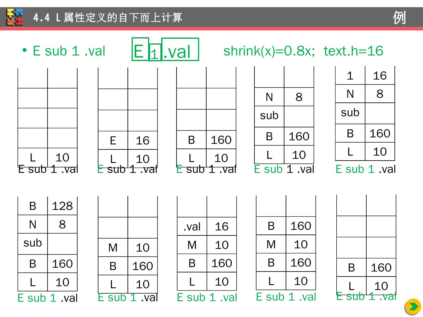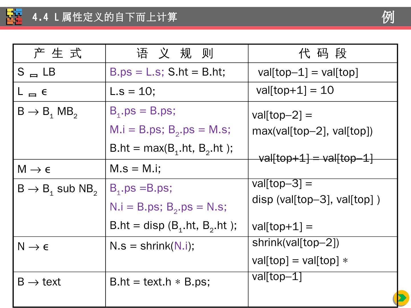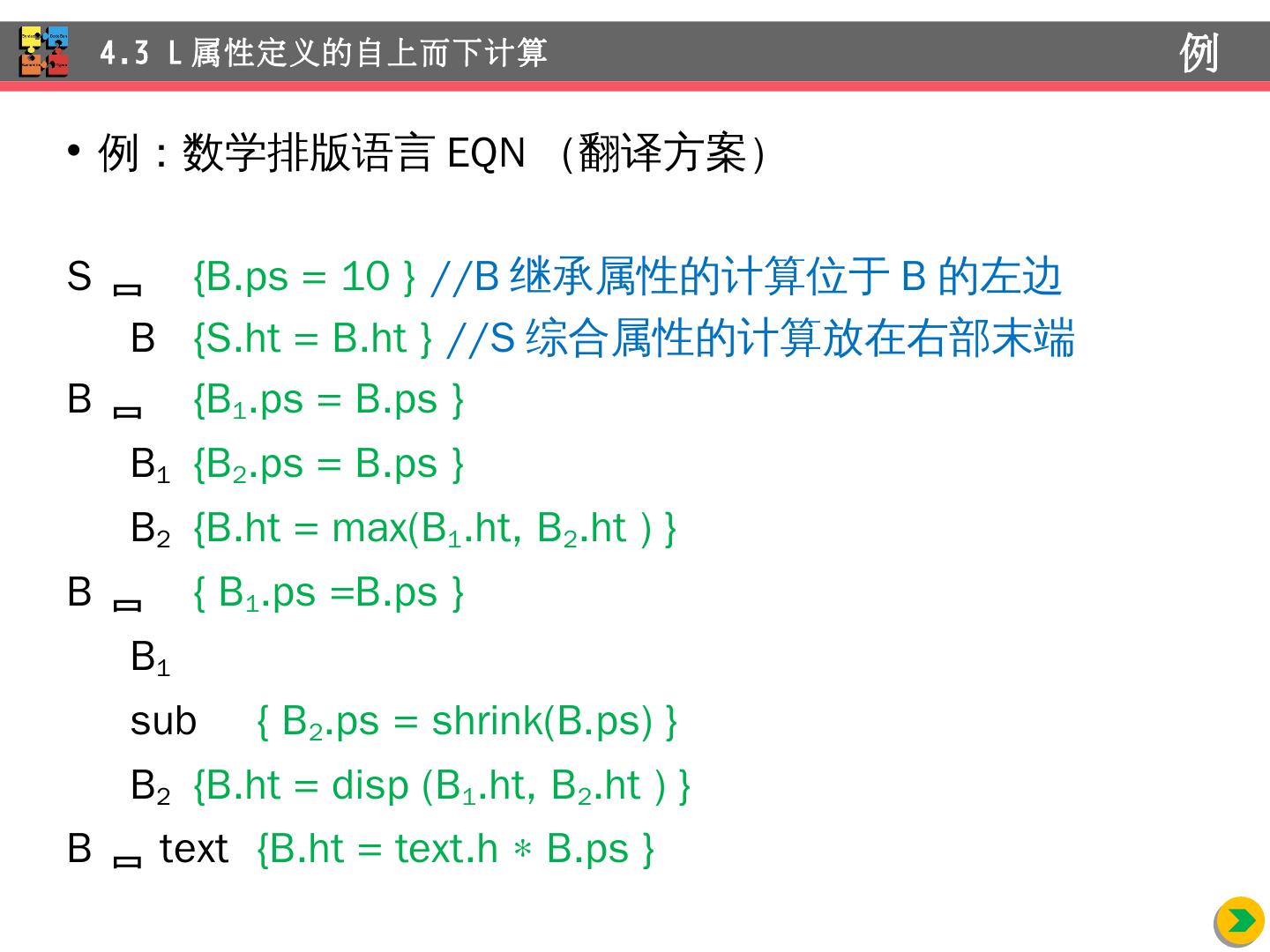 28 .例:数学 排版语言 EQN (语法 制导 定义) S B B B 1 B 2 B B 1 sub B 2 B text 4.3 L 属性 定义的自上而下计算 例 产 生 式 语 义 规 则 S B B.ps = 10; S.ht = B.ht B B 1 B 2 B 1 .ps = B.ps; B 2 .ps = B.ps; B.ht = max(B 1 .ht, B 2 .ht ) B B 1 sub B 2 B 1 .ps =B.ps; B 2 .ps = shrink(B.ps); B.ht = disp (B 1 .ht, B 2 .ht ) B text B.ht = text.h B.ps E 1 . val E sub 1 . val
