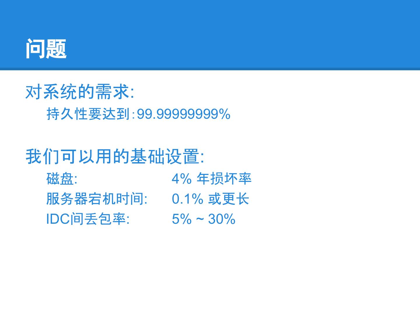 4 .问题 对系统的需求: 持久性要达到:99.99999999% 我们可以用的基础设置: 磁盘: 4% 年损坏率 服务器宕机时间: 0.1% 或更长 IDC间丢包率: 5% ~ 30%