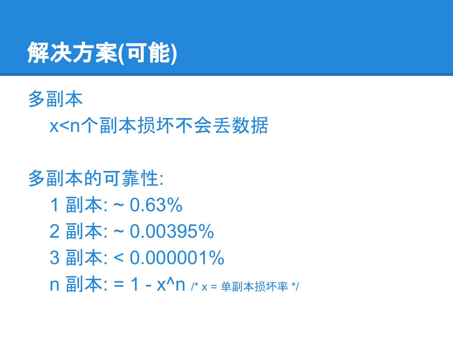 5 .解决方案(可能) 多副本 x<n个副本损坏不会丢数据 多副本的可靠性: 1 副本: ~ 0.63% 2 副本: ~ 0.00395% 3 副本: < 0.000001% n 副本: = 1 - x^n /* x = 单副本损坏率 */