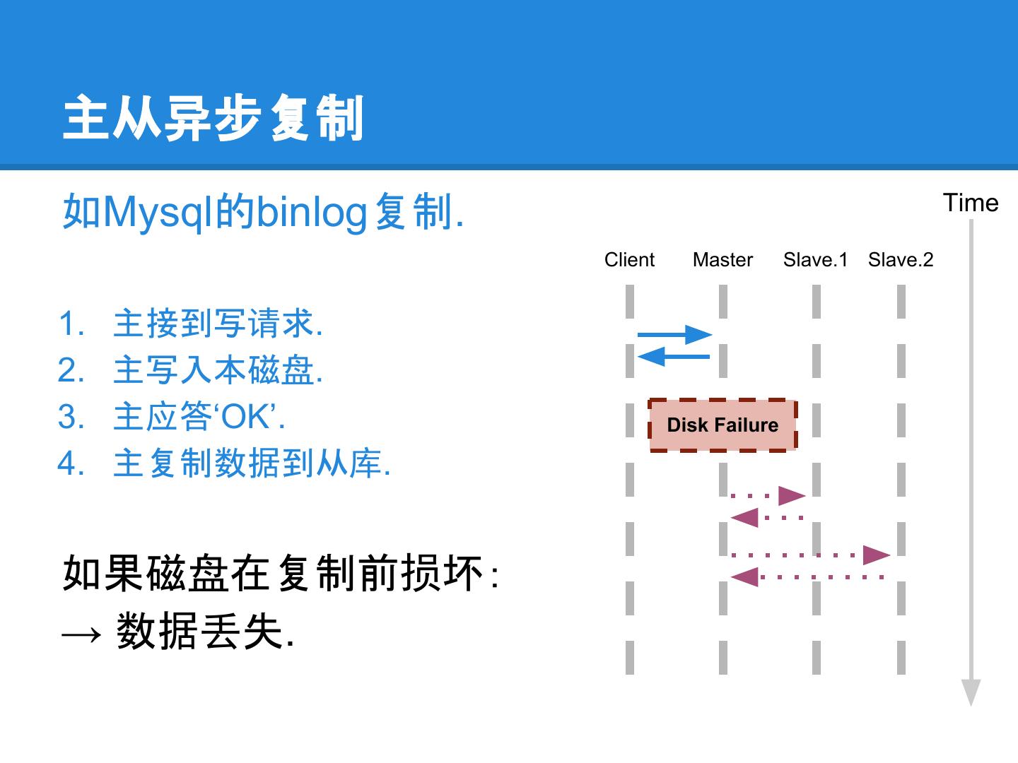 8 .主从异步复制 如Mysql的binlog复制. Time Client Master Slave.1 Slave.2 1. 主接到写请求. 2. 主写入本磁盘. 3. 主应答‘OK’. Disk Failure 4. 主复制数据到从库. 如果磁盘在复制前损坏: → 数据丢失.